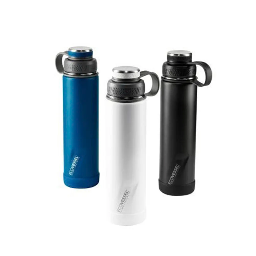 Termo de acero inoxidable con doble pared insulado al vacío con agarradera en la tapa.