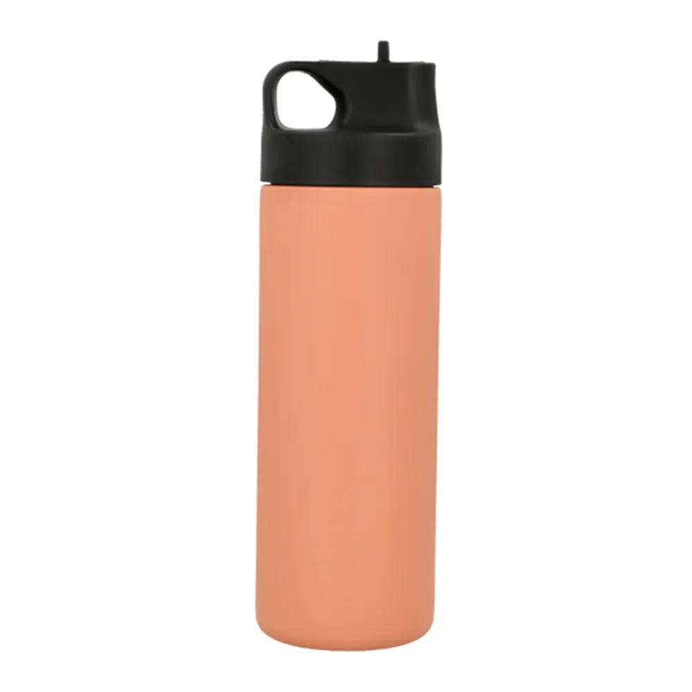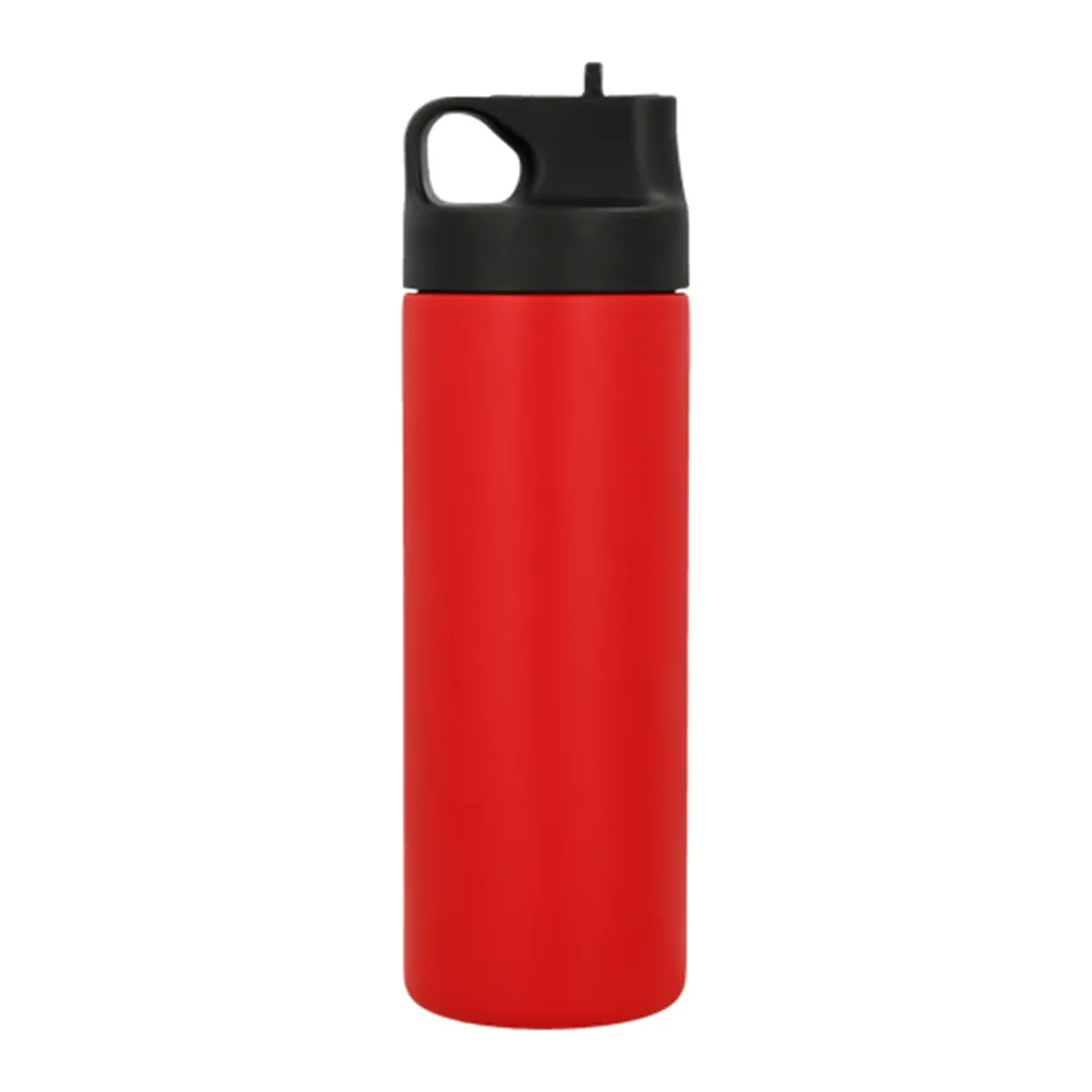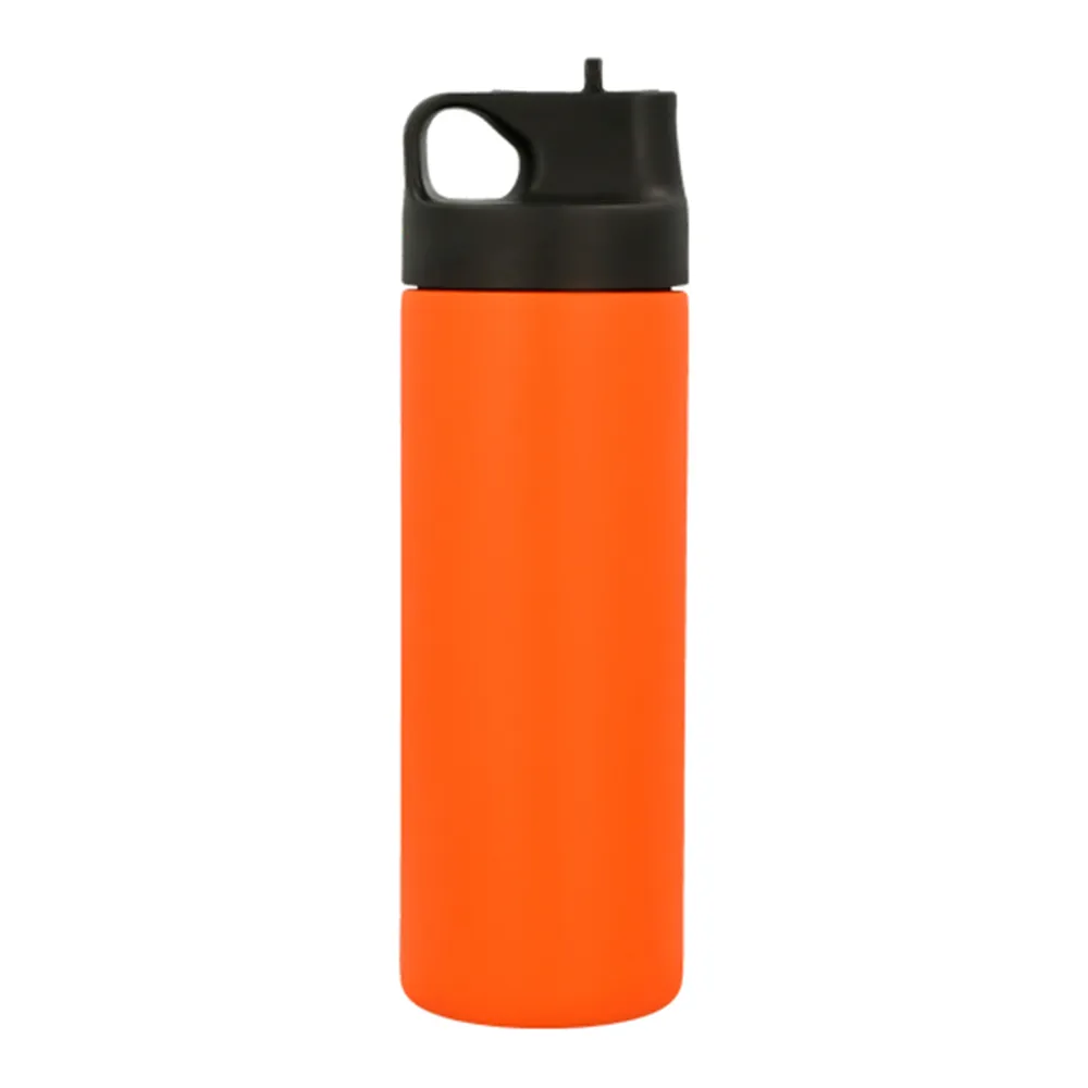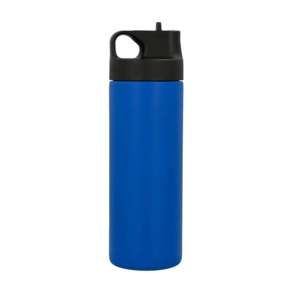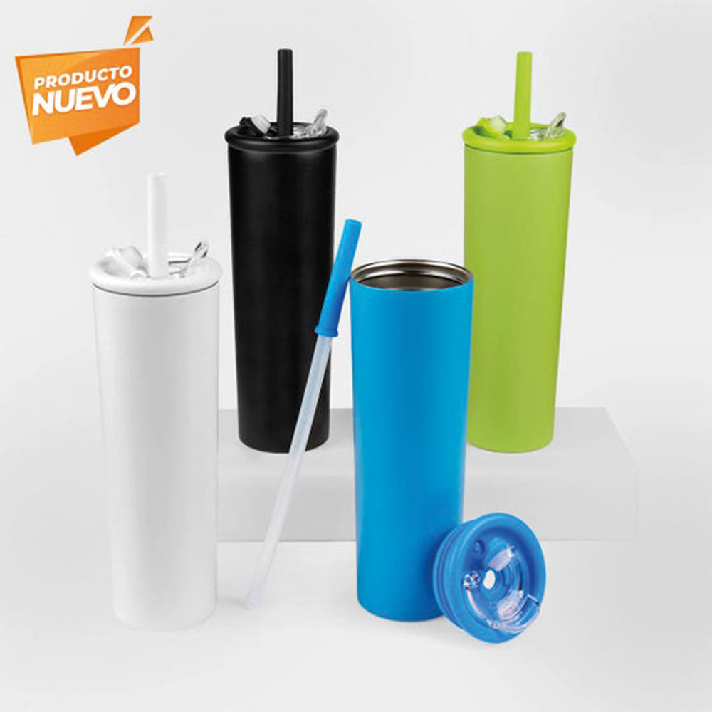 Termo de acero inoxidable de doble pared insulado al vacío con acabado rugoso, su tapa enroscable cuenta con una agarradera, boquilla abatible y popote.