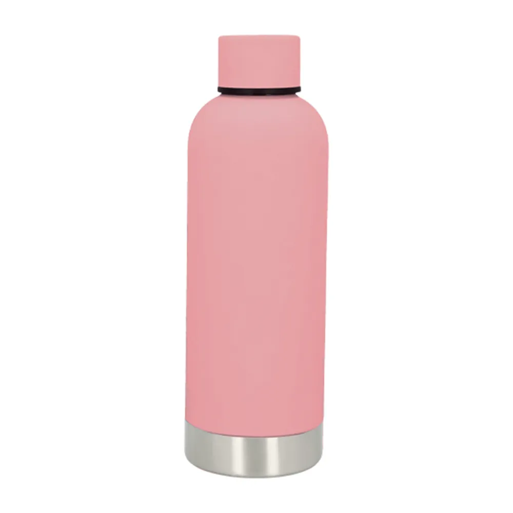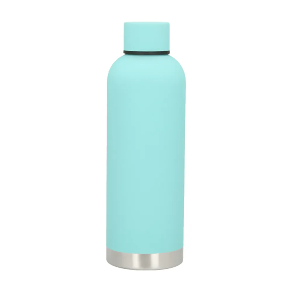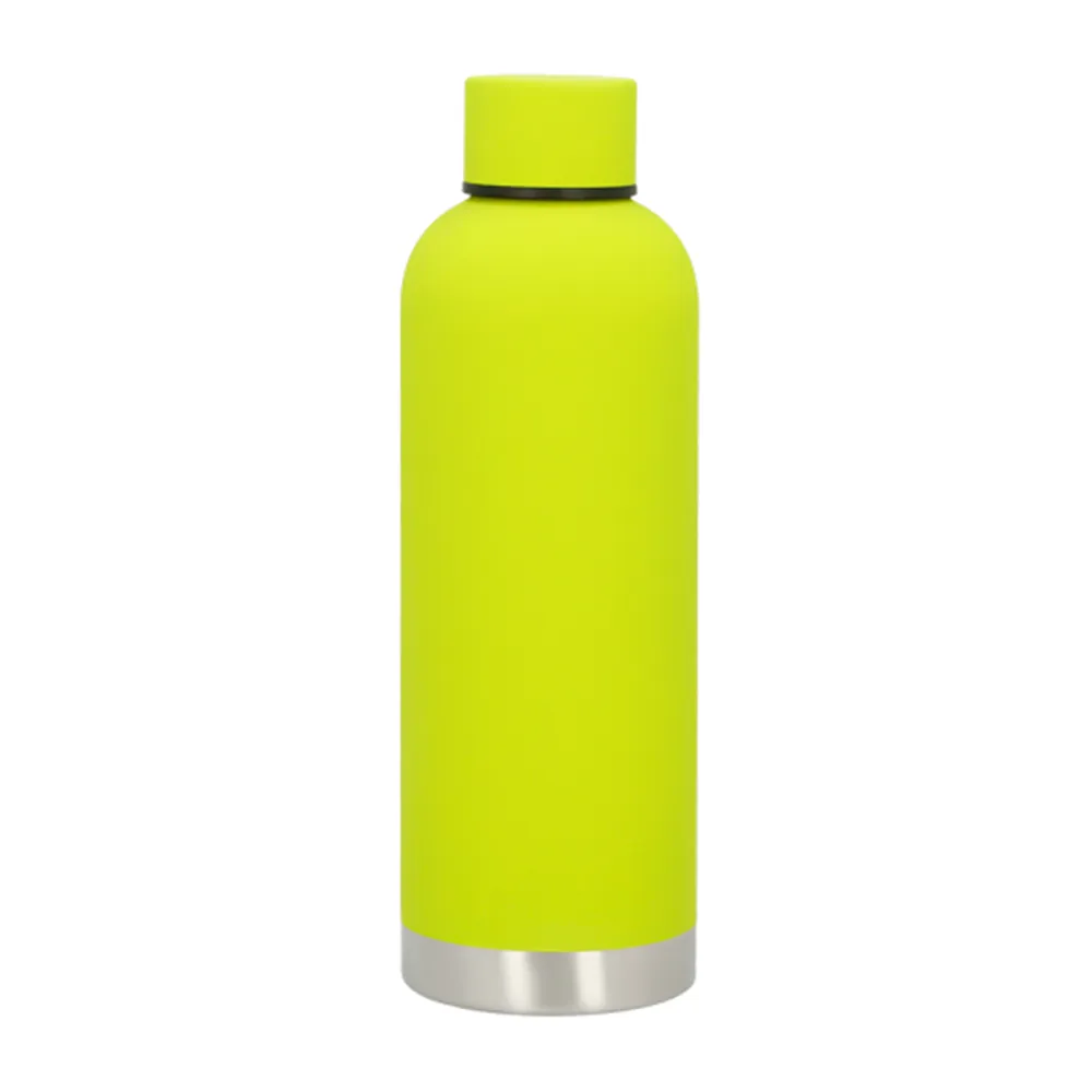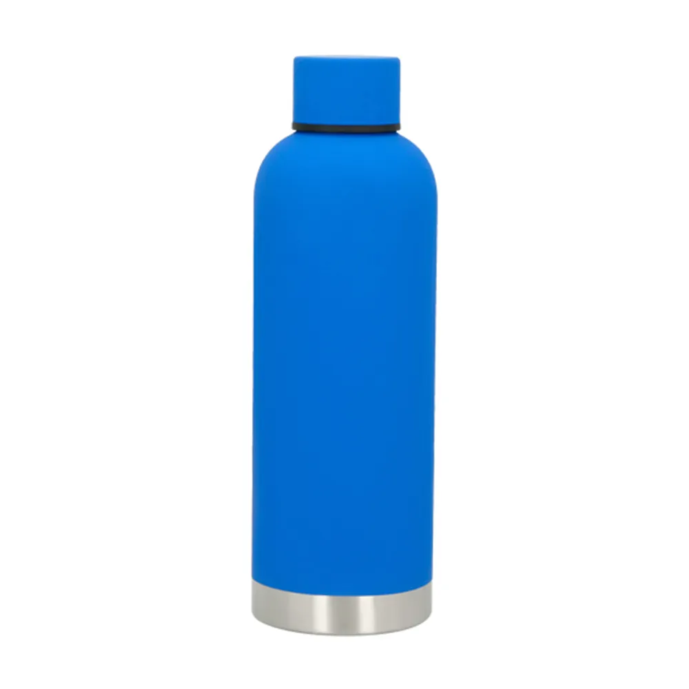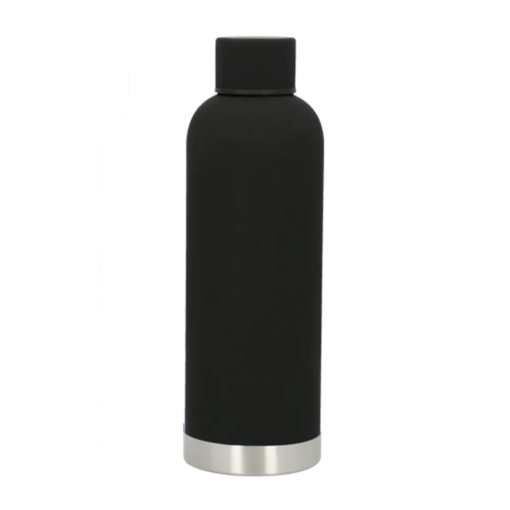 Termo de acero inoxidable de doble pared insulado al vacío con acabado rubber y tapa enroscable.