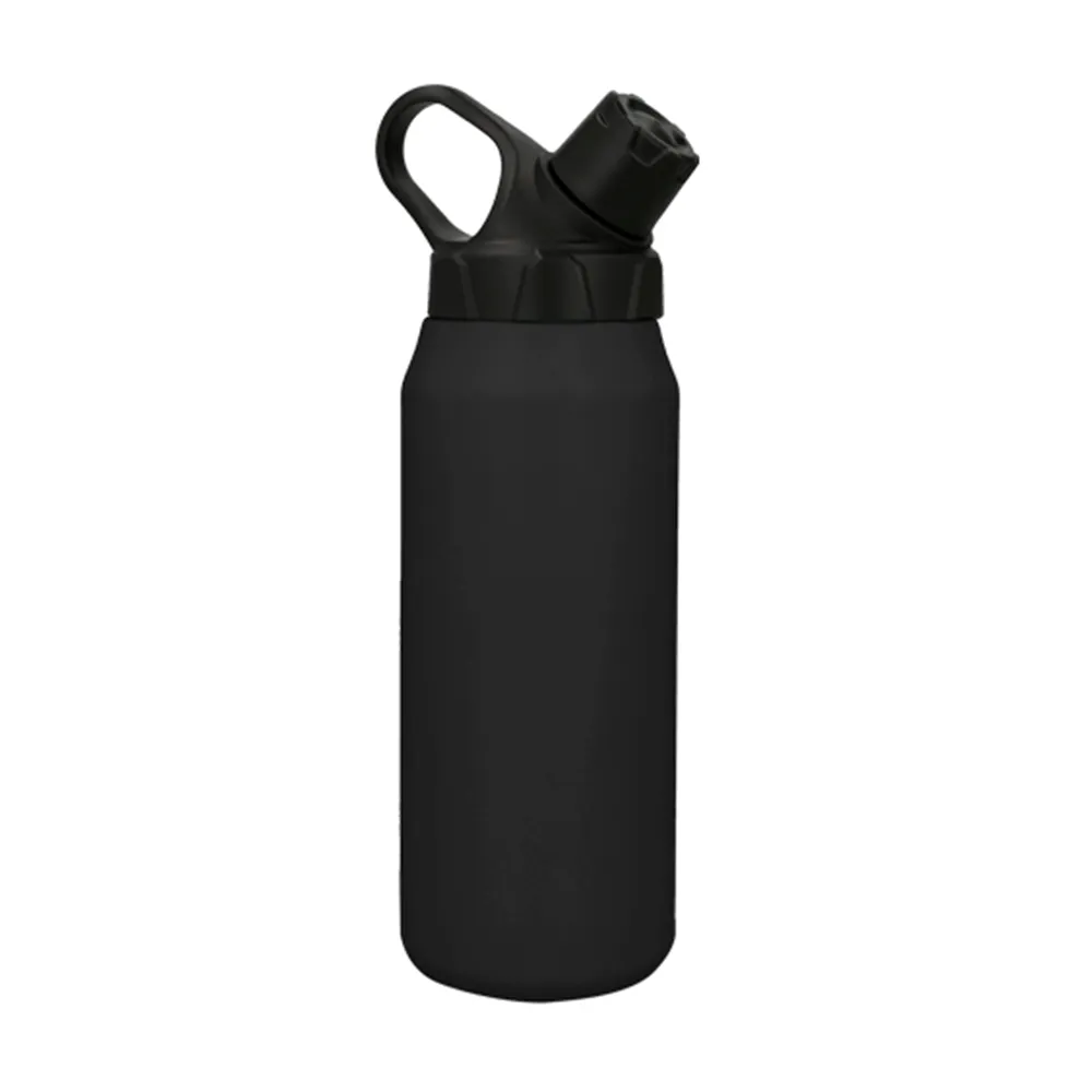 Termo de acero inoxidable de doble pared insulado al vacío con acabado rugoso, su tapa cuenta con una boquilla con tapa enroscable y asa.