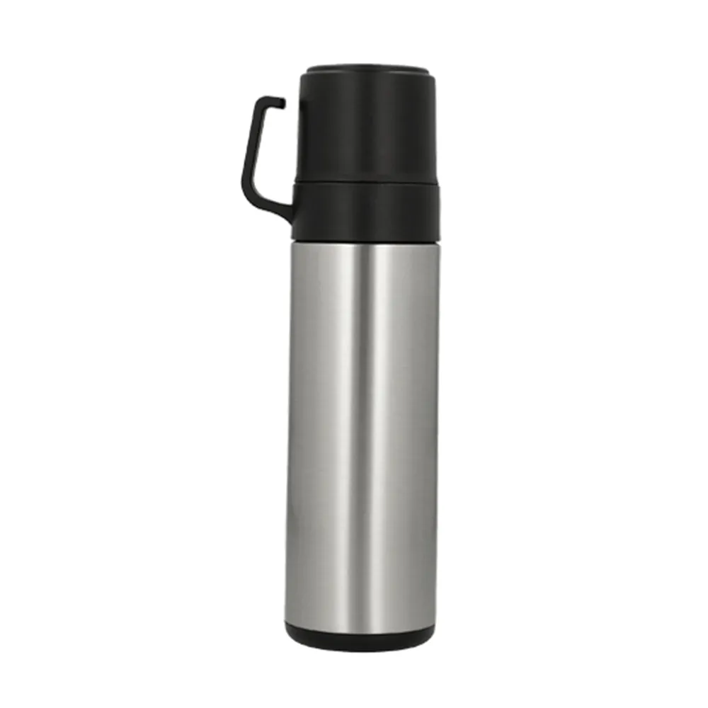 Termo de acero inoxidable de doble pared insulado al vacío, válvula de seguridad y tapa que funciona como taza. Incluye una segunda taza.