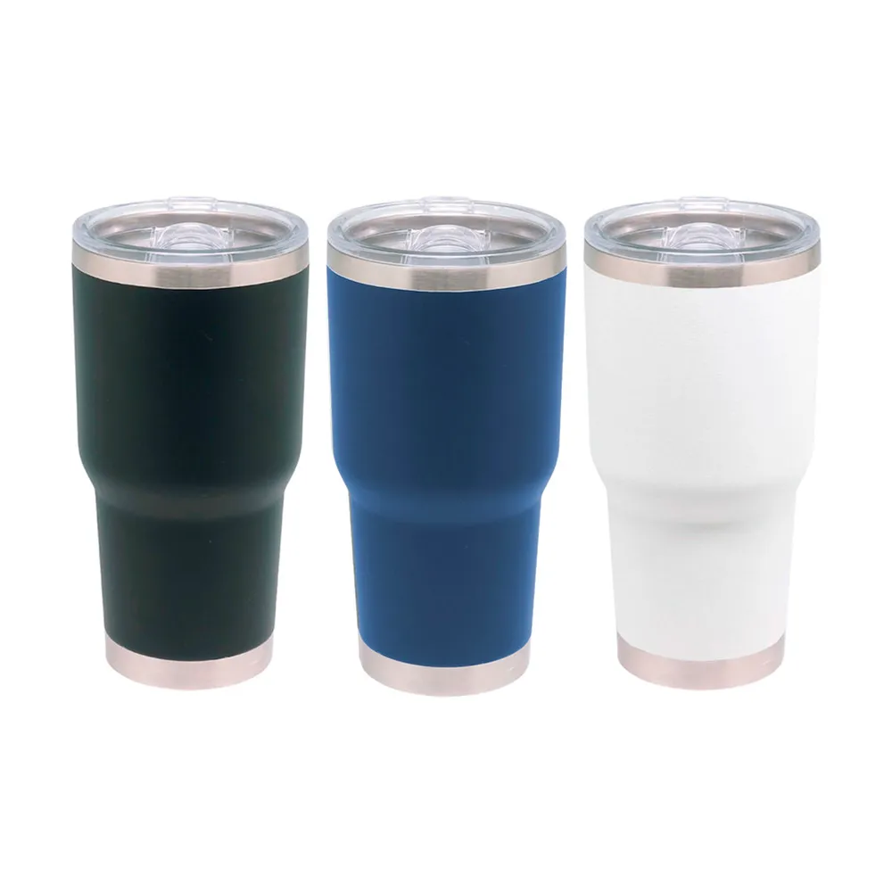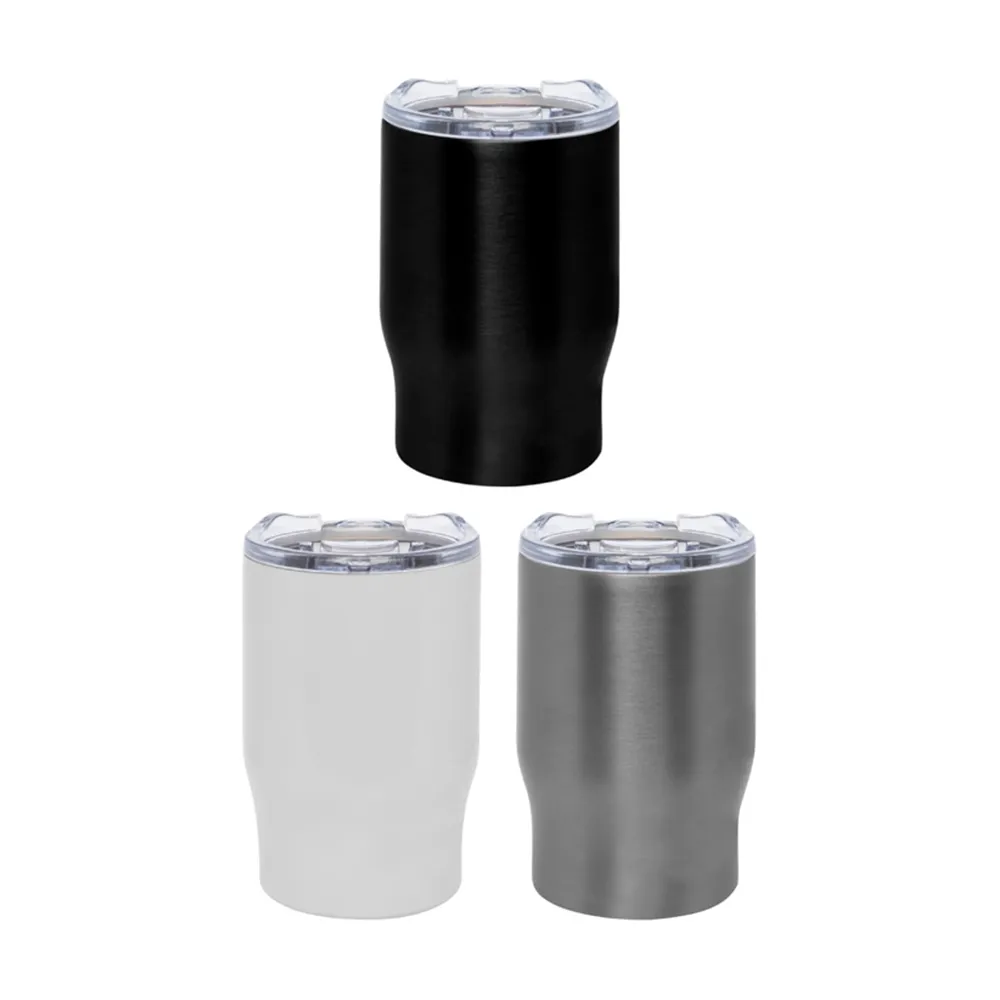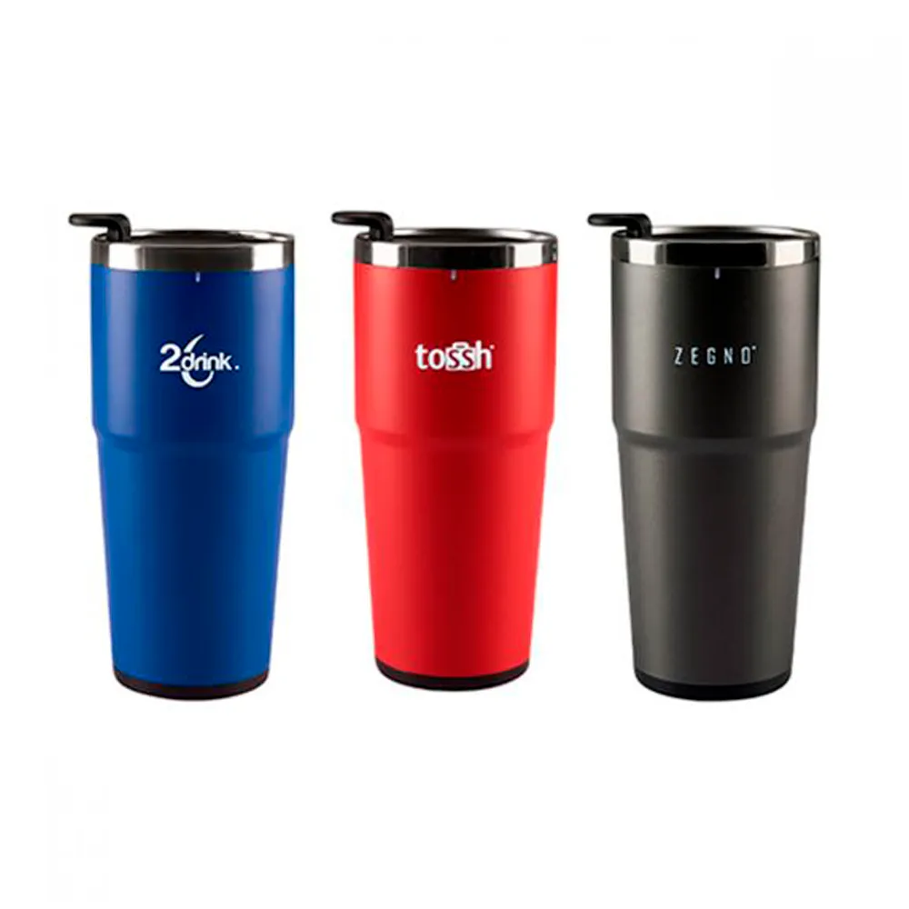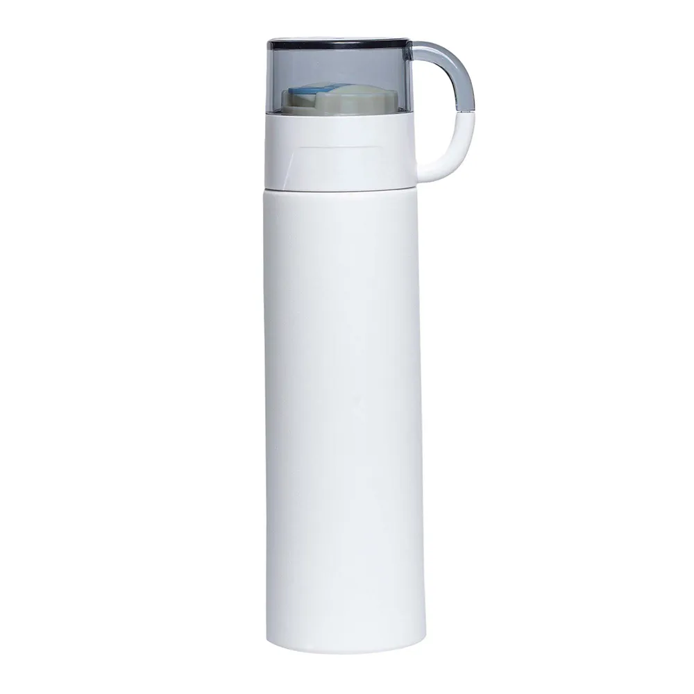 Termo de acero inoxidable, insulado al vacío, con tapa que sirve como taza.