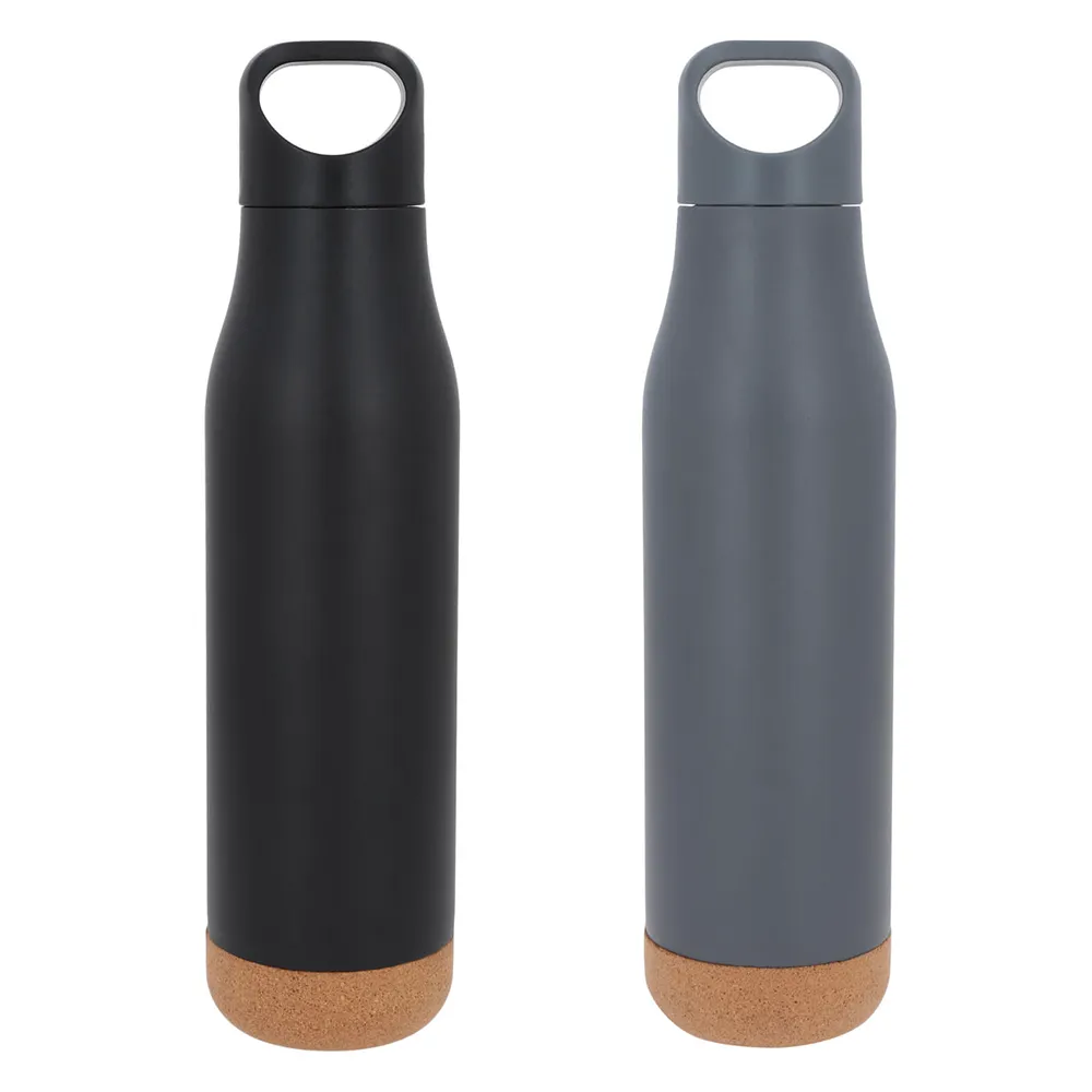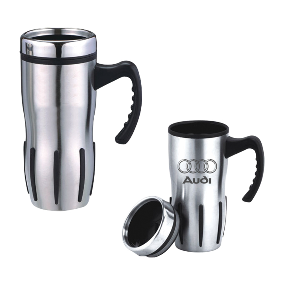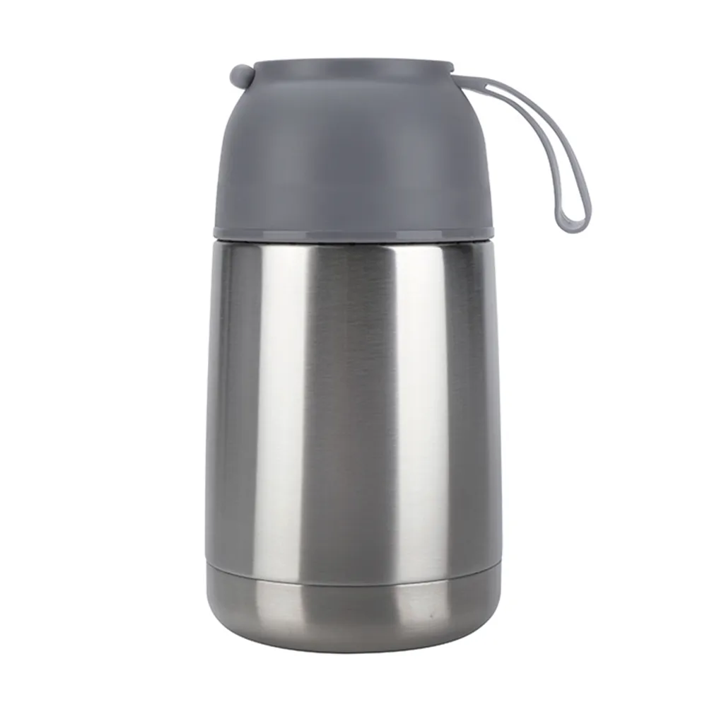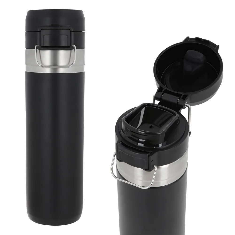 Termo de acero inoxidable, insulado al vacío, con tapa enroscable, botón con candado de seguridad y cintillo de silicón.