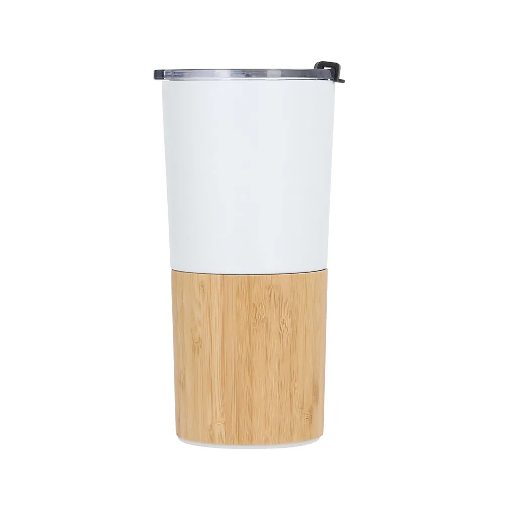 Termo con acabado rugoso insulado al vacío, con detalle en bambú, doble pared de acero inoxidable y tapa de cierre a presión.