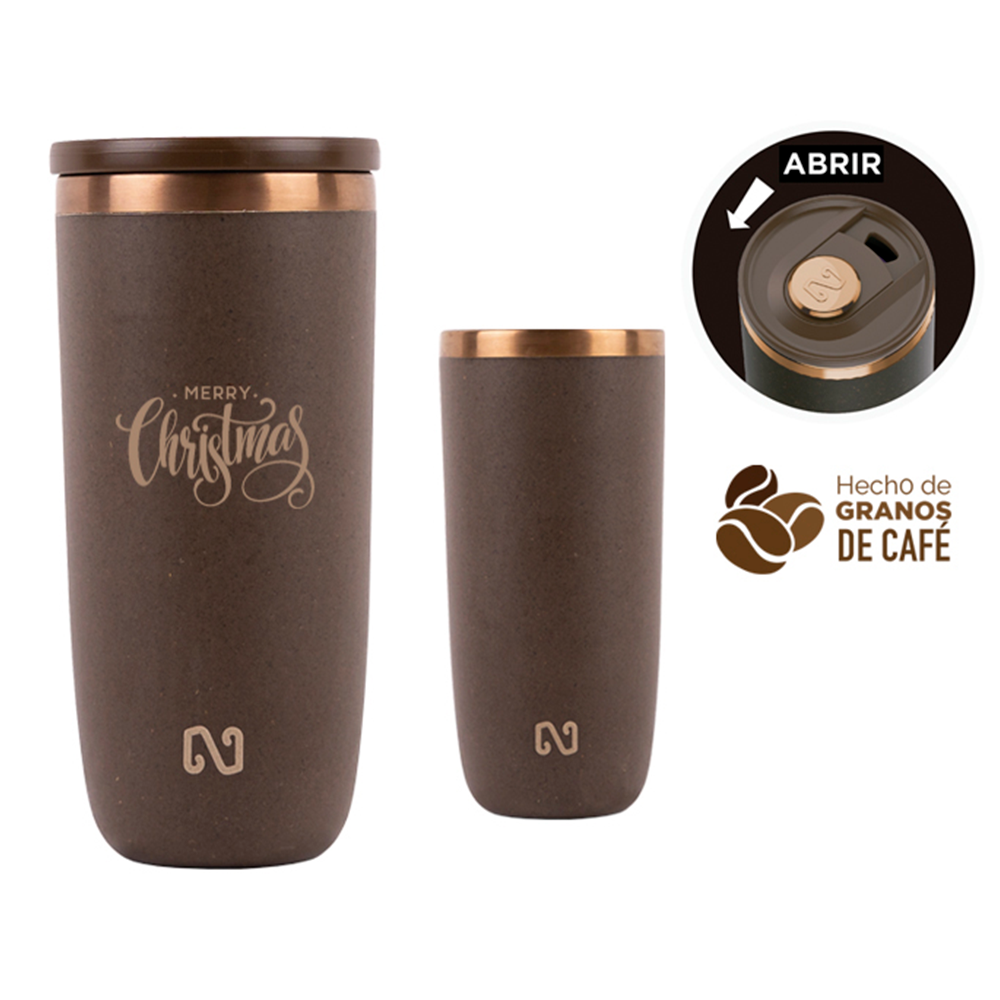 Termo con doble pared de acero inoxidable, insulado al vacío, acabado rugoso, con manga de silicón y tapa de cierre a presión.