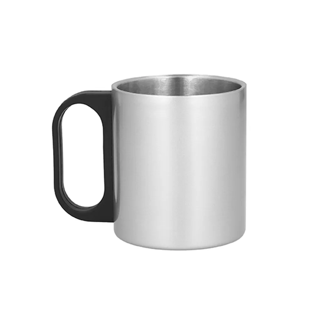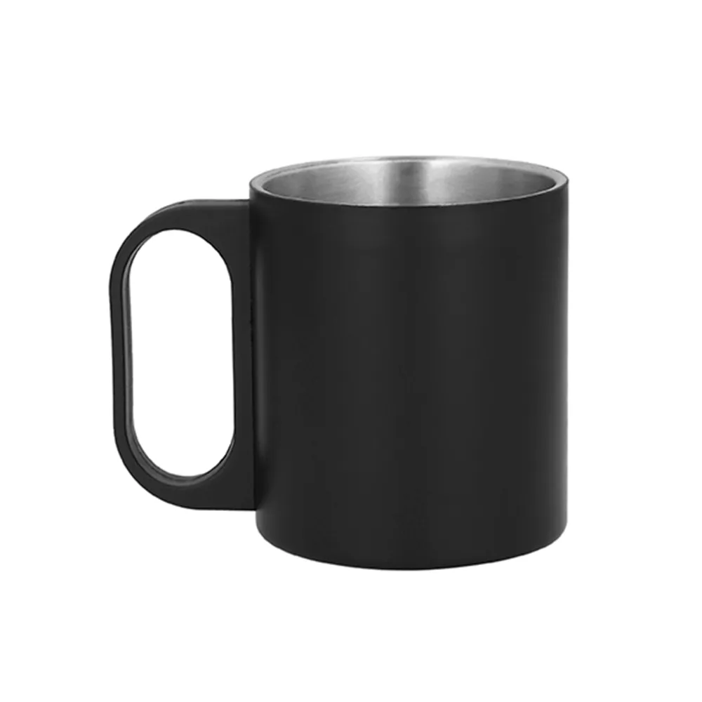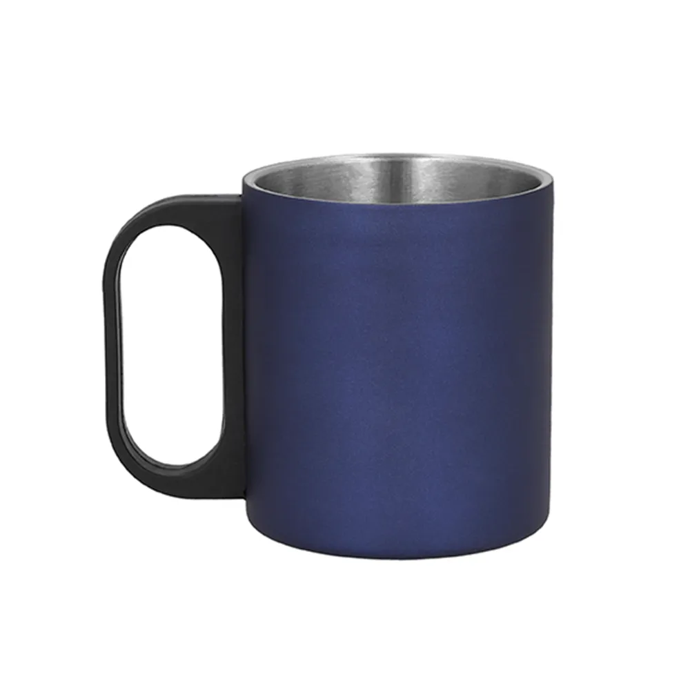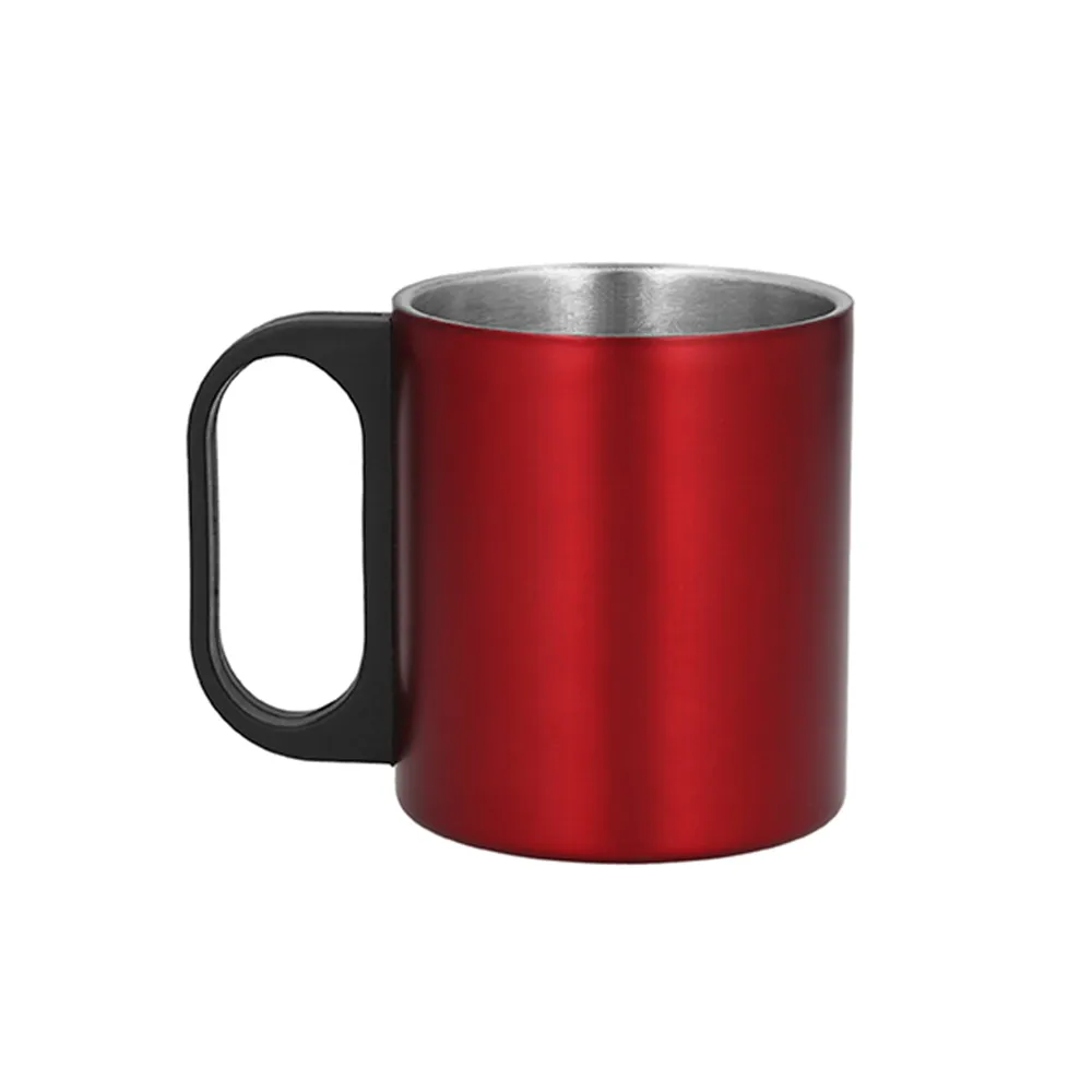 Taza de acero inoxidable acabado mate y asa de plástico.