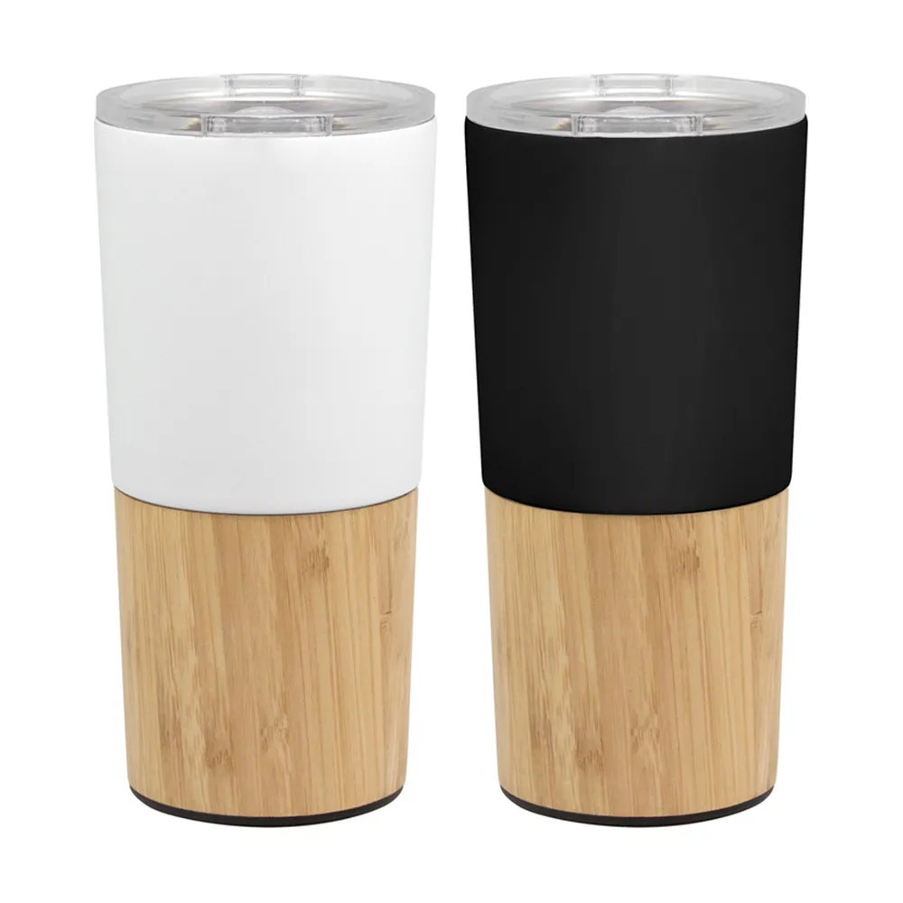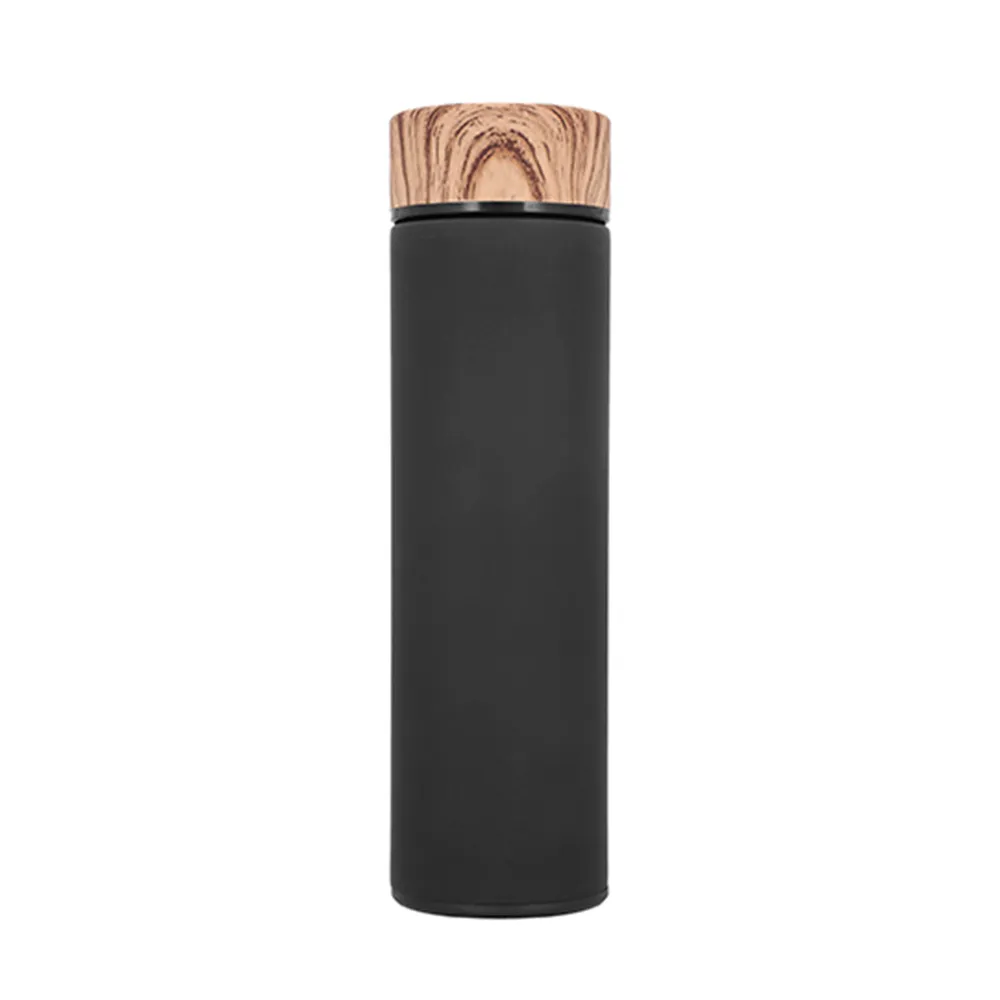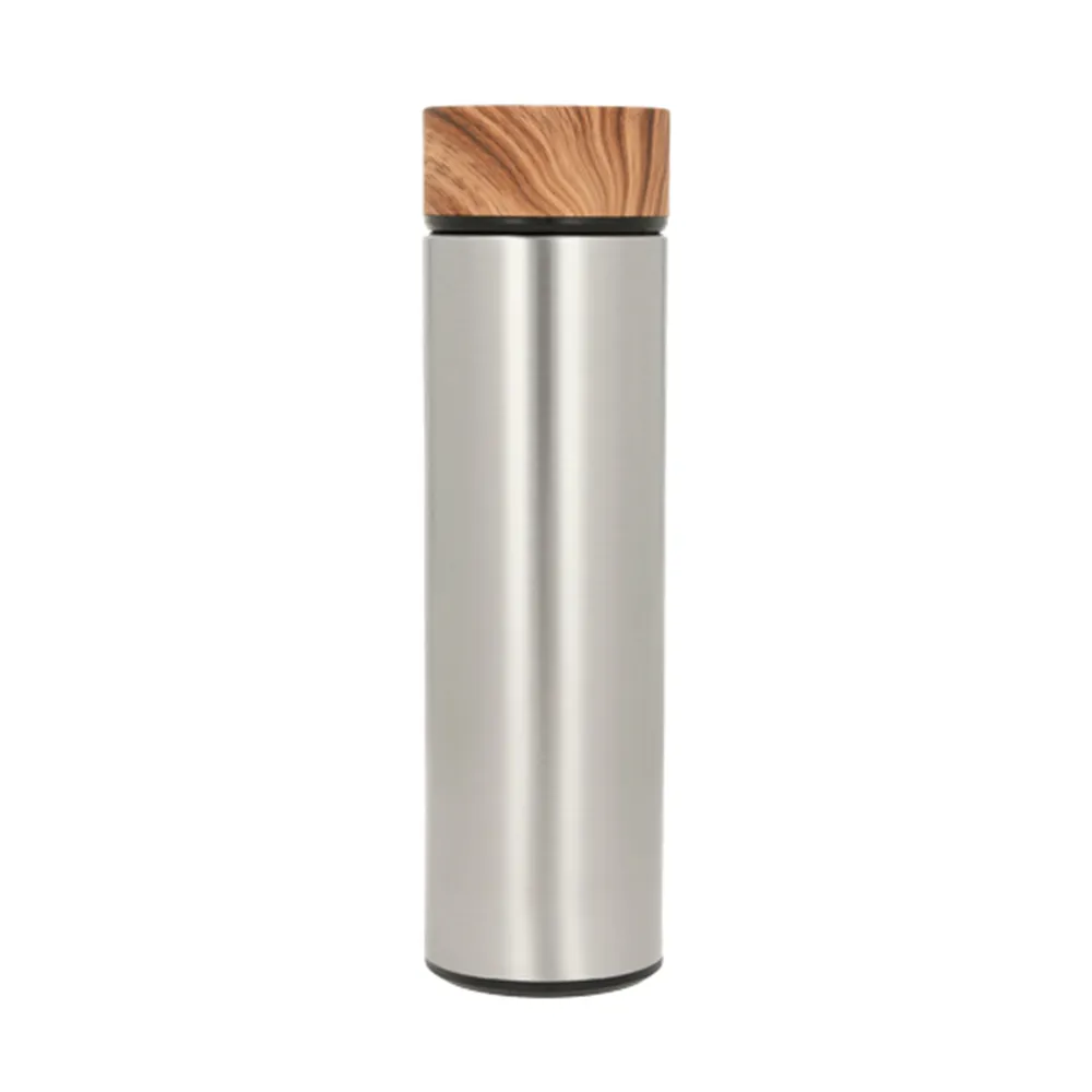 Termo de acero inoxidable con doble pared, acabado rubber, tapa con simulación de madera e infusor.