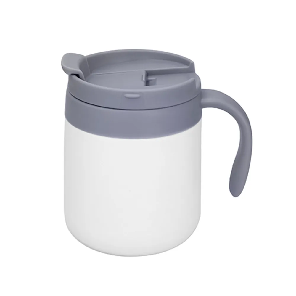 Termo con doble pared de acero inoxidable, con base de silicón, asa de plástico y tapa de cierre a presión con válvula de seguridad.