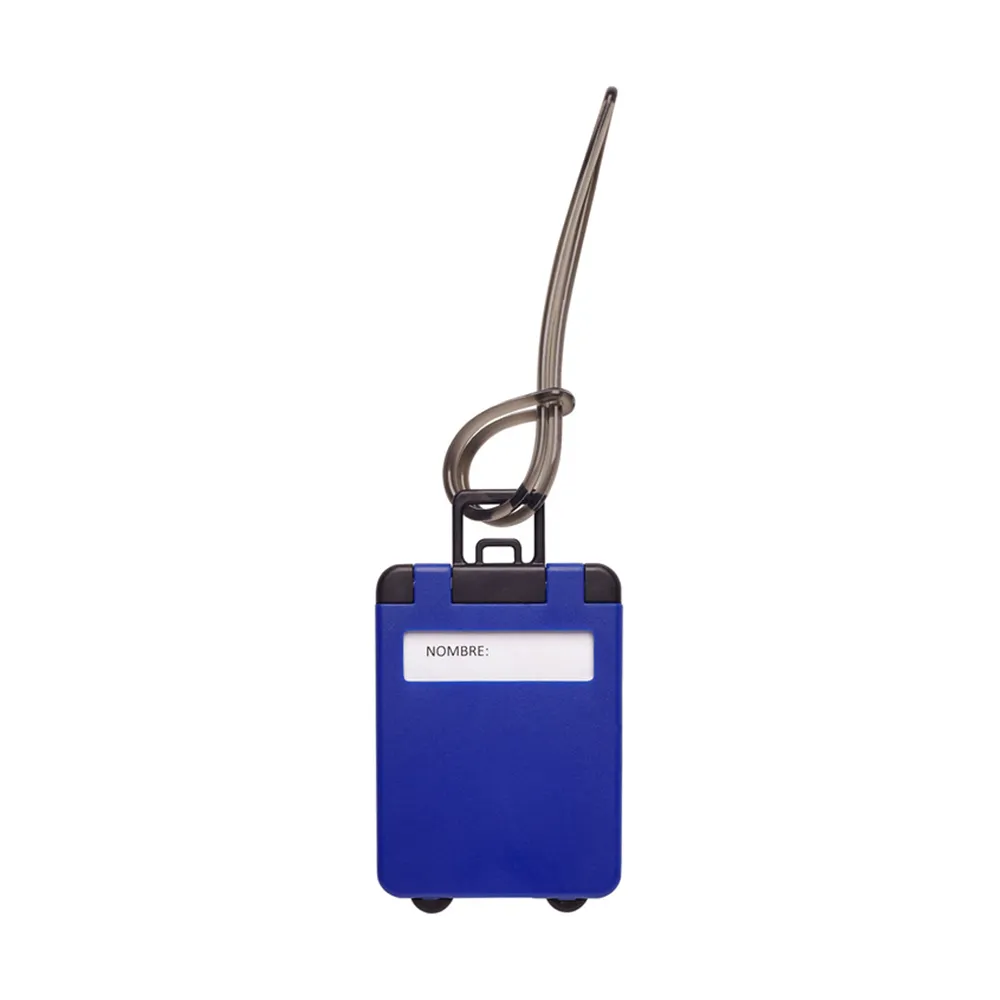Identificador de maletas. Cuenta con etiqueta para poner nombre, lazo de plástico para colgar en la manija del equipaje.