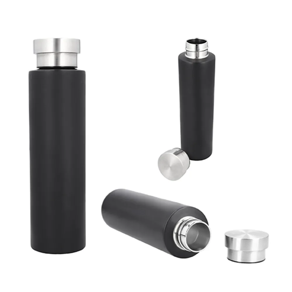 Doble pared. Tapa a rosca, botón para abrir y cerrar. Lazo para sujetar en la muñeca. Base antideslizante.