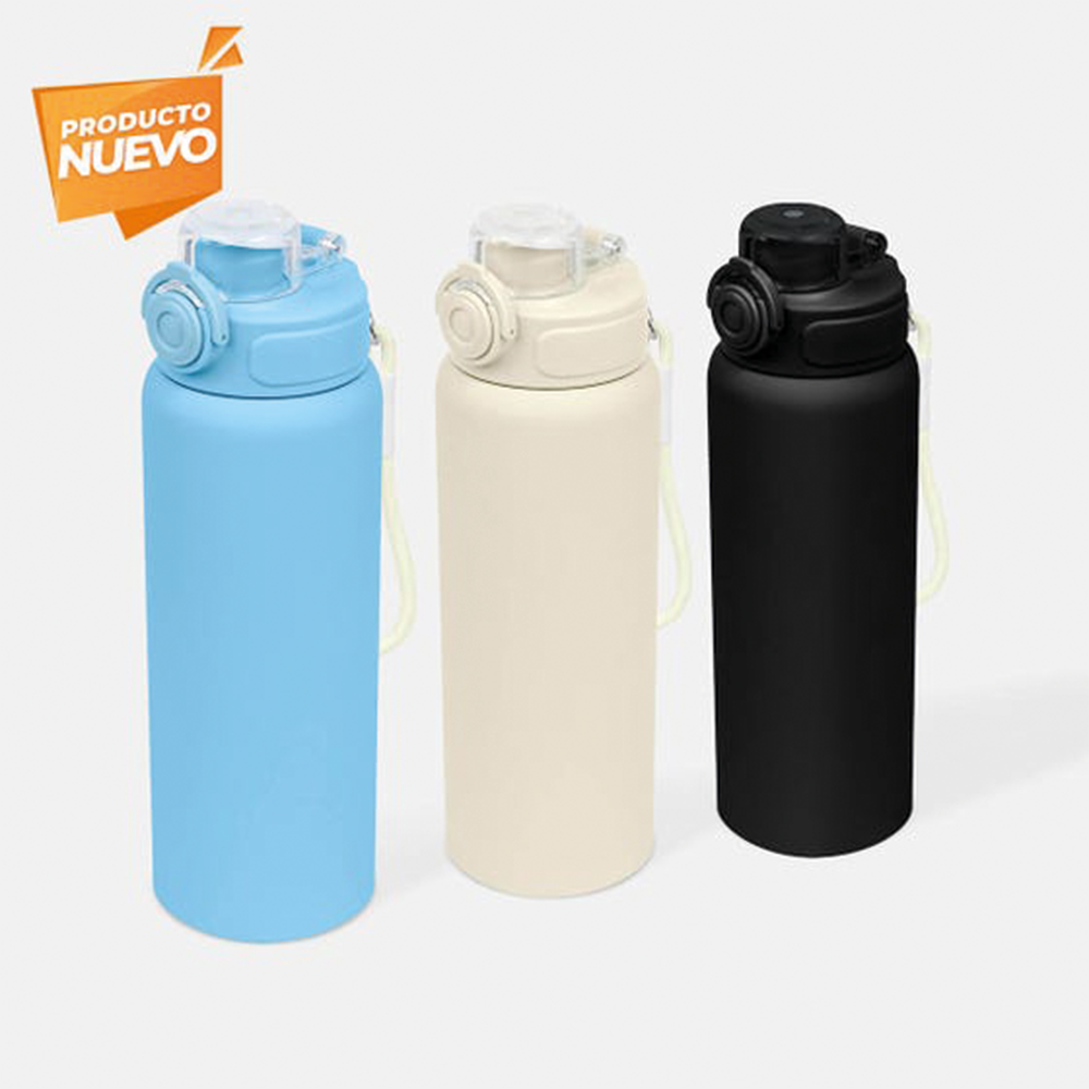 Botella doble pared, sellada al vacío. Interior de acero 304 y exterior de acero 201. Tapa plástica PP + Anillo de silicona antiderrame. Posee además tira de color gris de 12 cm de largo. Ideal para llevarla a todos lados. Mantiene hasta 12 hs la temperatura de las bebidas calientes y 24 hs de las bebidas frías. Presentación en caja de regalo Kraft.