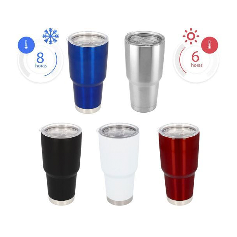 Termo con doble pared sellado al vacío. Acero inoxidable 304 interior / 201 exterior. Tapa y taza plásticas en color negro. Pintura acabado mate.
