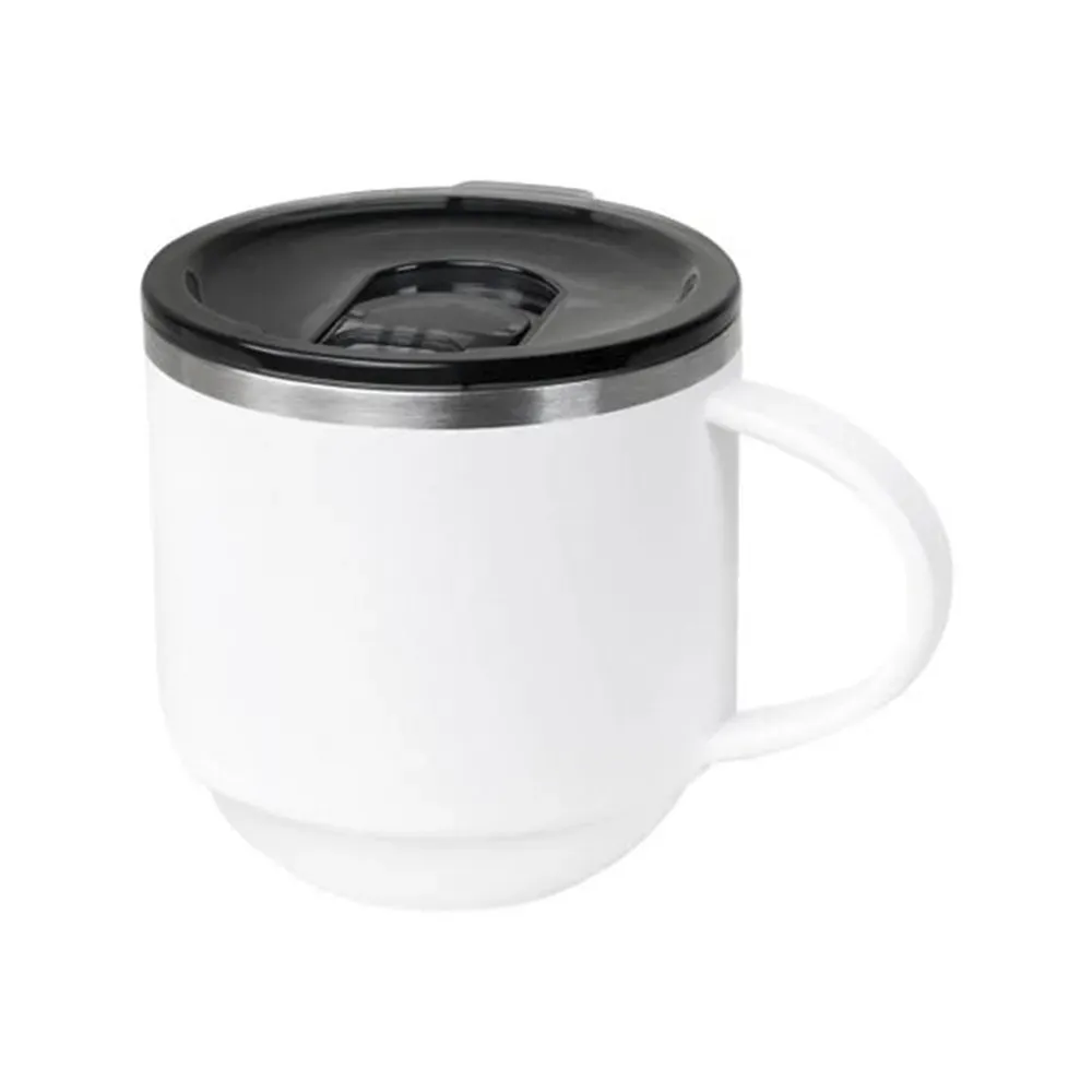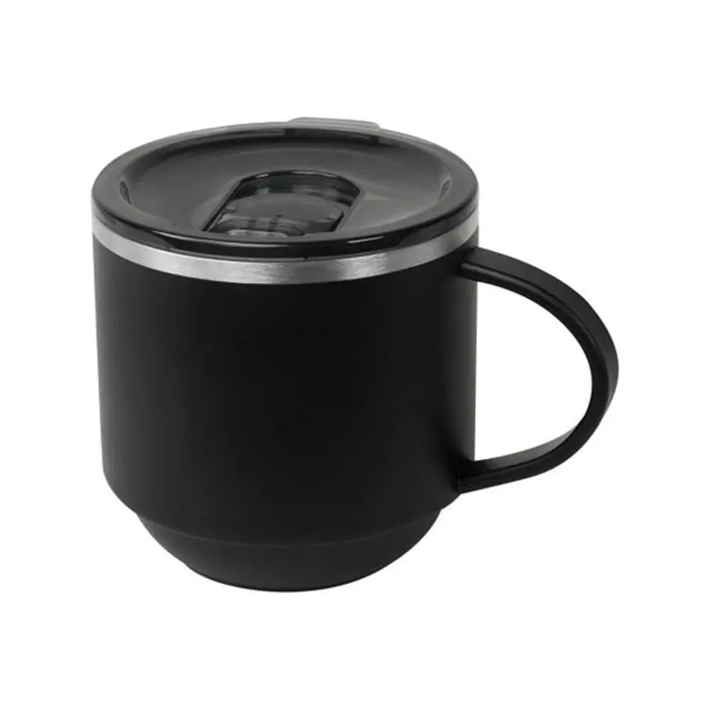 Taza doble pared. Cerrado al vacío. Pared interna y externa de acero inoxidable. Terminado rugoso. Incluye tapa de plástico con sistema push y válvula de seguridad. Mantiene temperatura caliente 6 hrs y temperatura fría 12 hrs. Incluye caja individual.