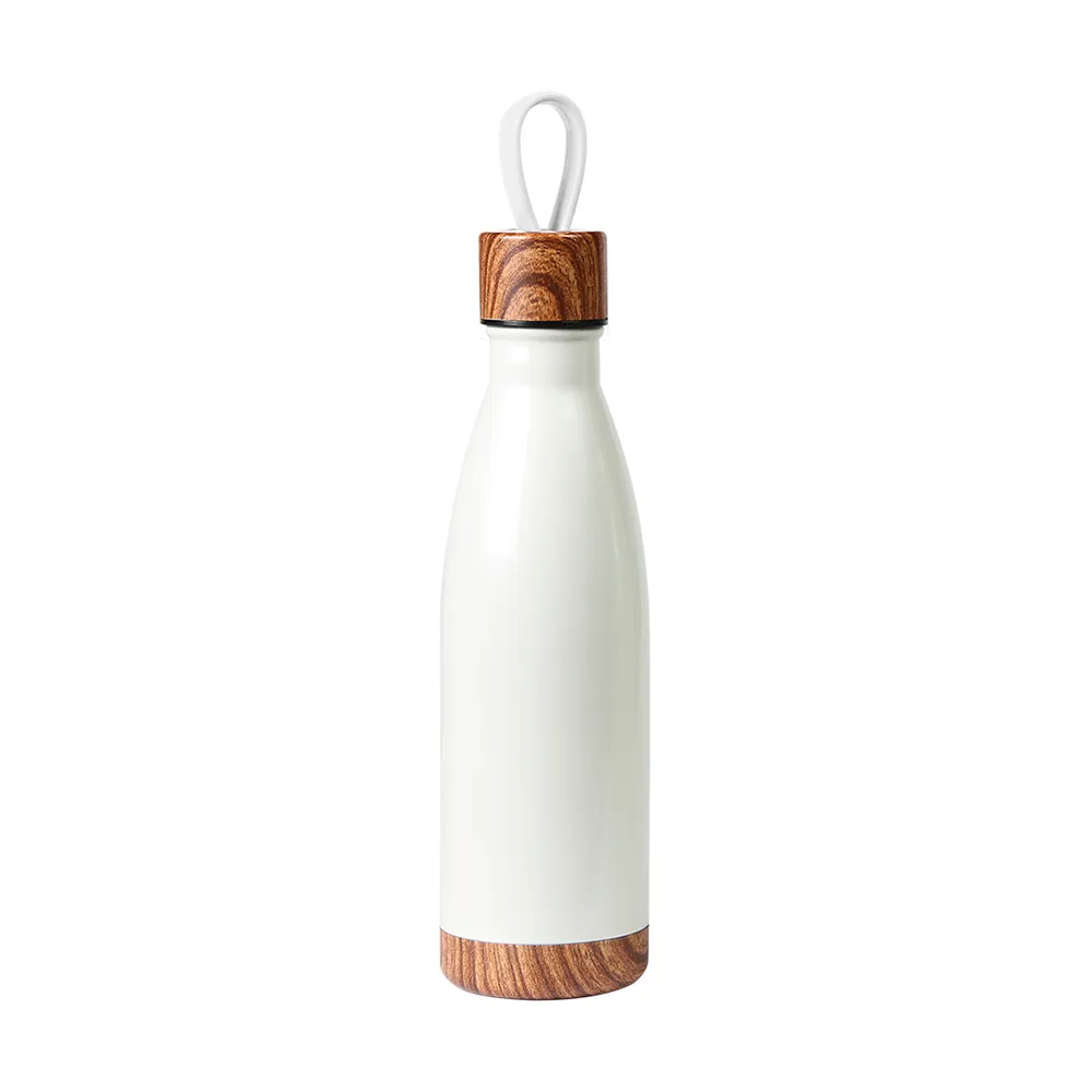 Termo de acero inoxidable doble pared, con correa de TPR, tapa de rosca y detalles apariencia madera, fabricado en materiales de grado alimenticio, mantiene bebidas frías o calientes por un largo tiempo, no usar en microondas. Capacidad de 500 ml (17 oz). Incluye caja de cartón individual.