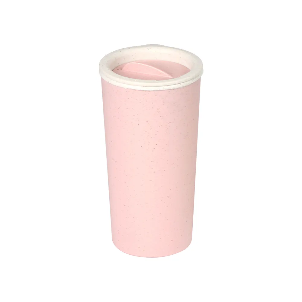 Vaso fabricado en 25% fibra de trigo y 75% polipropileno, tapa deslizable con anillo de silicón anti derrames. Fabricado en materiales de grado alimenticio, ideal para bebidas frías o calientes, no usar en microondas. Capacidad 400 ml. Incluye caja de cartón individual.