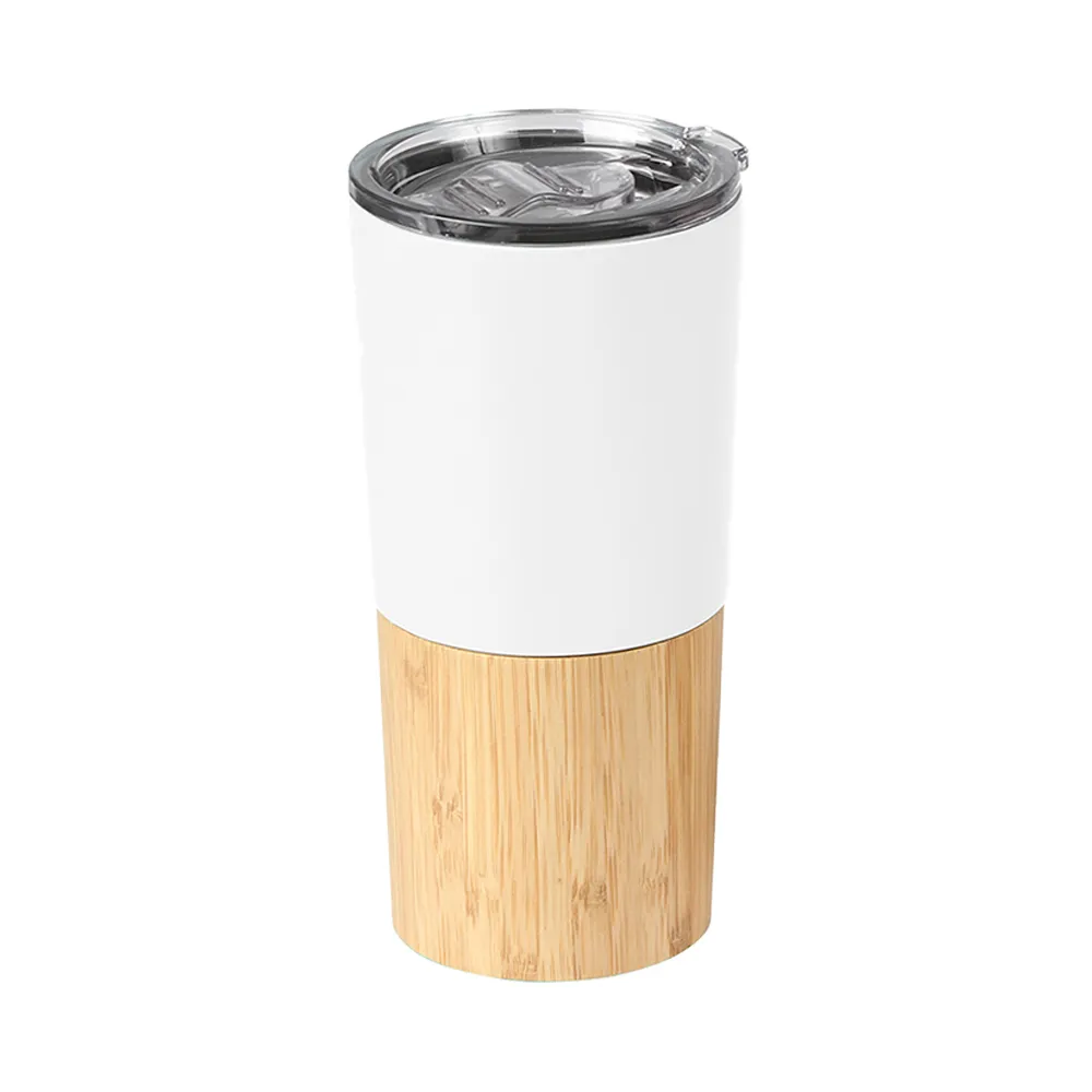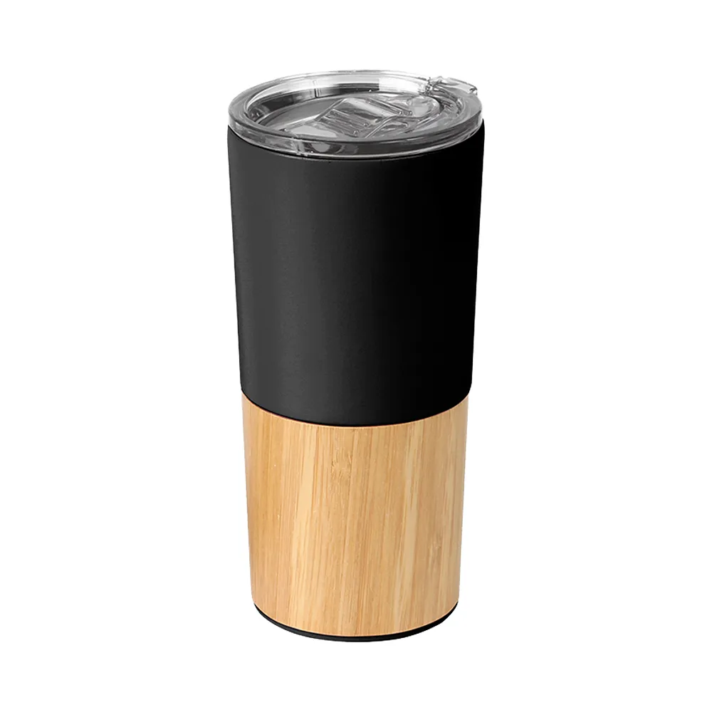 Termo de acero inoxidable doble pared con detalle en bambú, tapa plástica deslizable, fabricado en materiales de grado alimenticio, mantiene bebidas frías o calientes por un largo tiempo. No usar en microondas. Capacidad de 600 ml. Incluye caja de cartón individual.