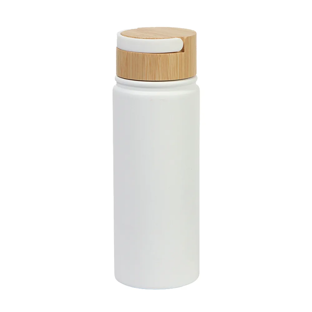 Termo de acero inoxidable doble pared con tapa de bambú y plástico. Fabricado en materiales de grado alimenticio, mantiene bebidas frías o calientes por un largo tiempo. No usar en microondas. Capacidad de 500 ml. Incluye caja de cartón individual.