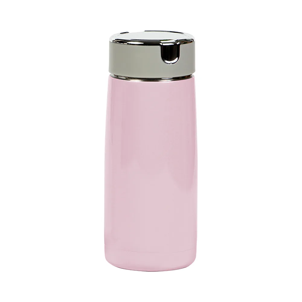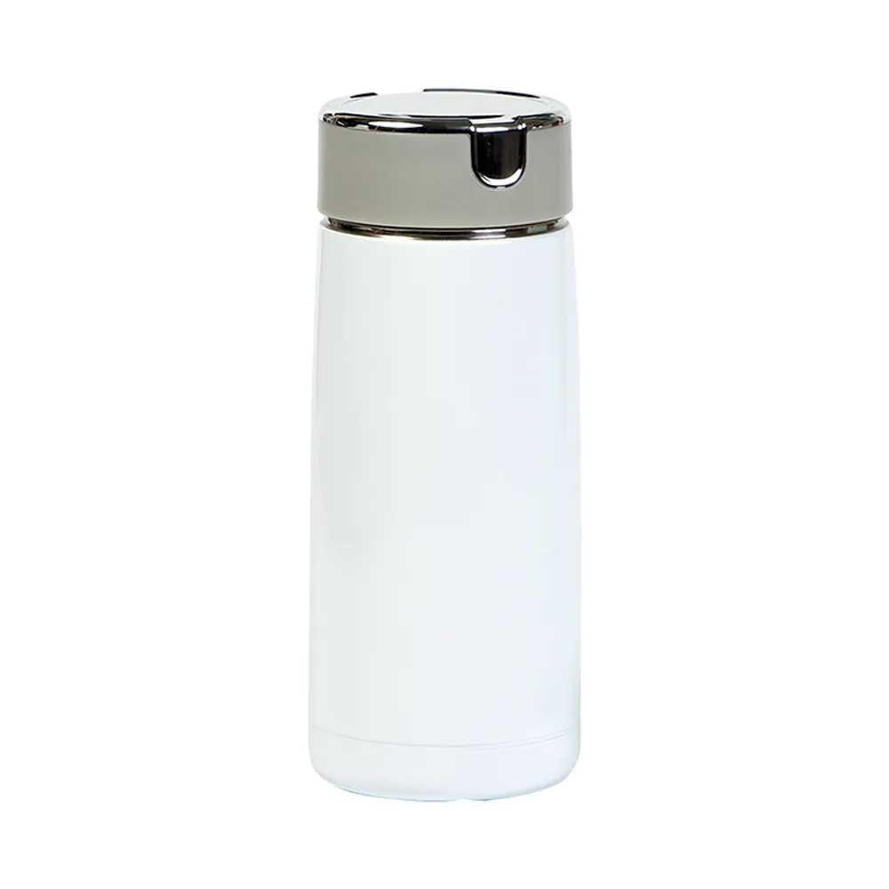 Termo de acero inoxidable con acabado brillante, doble pared con tapa de plástico de rosca, fabricado en materiales de grado alimenticio, mantiene bebidas frías o calientes por un largo tiempo. No usar en microondas. Capacidad de 310 ml. Incluye caja de cartón individual.