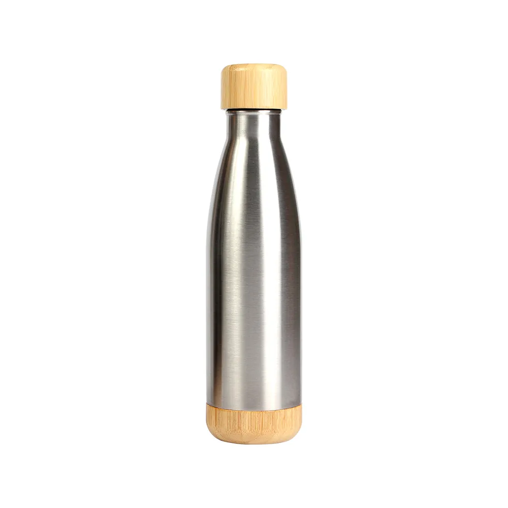 Botella plateada fabricada en acero inoxidable reciclado doble pared con tapa de rosca fabricada en bambú detalles en la base, del mismo material. Es una opción sostenible y elegante para mantener tus bebidas frías o calientes mientras contribuyes al cuidado del medio ambiente. No usar en microondas. Capacidad de 600 ml, Incluye caja individual