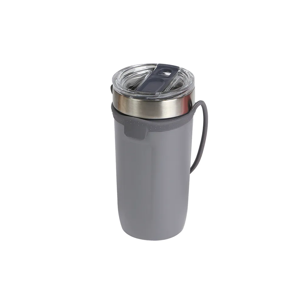 Termo fabricado con doble pared de acero inoxidable, asa de silicona y tapa deslizable antiderrames. El asa de silicona es ideal para llevar tus bebidas a todos lados sin la preocupación de sufrir derrames. Nuestro termo está fabricado en materiales de grado alimenticio y el acero inoxidable permite mantener tus bebidas frías o calientes por un largo tiempo. No usar en microondas. Capacidad de 480 ml.
