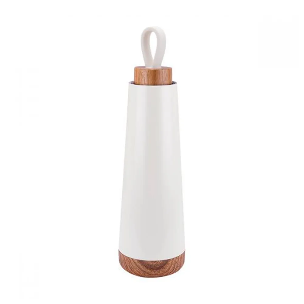 Doble pared. Cerrado al vacío. Pared interna y externa acero inoxidable. Tapa de madera de rosca con agarradera de silicón.