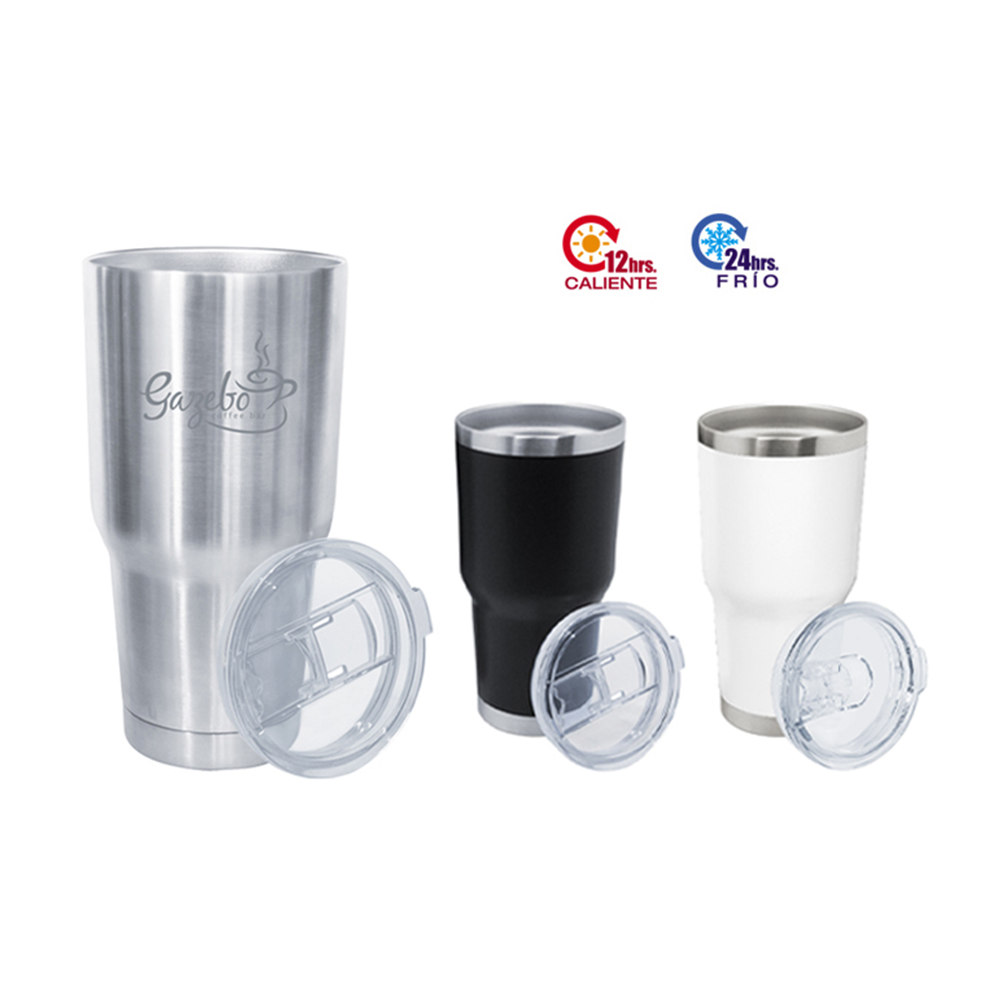 Doble pared. Cerrado al vacío. Pared interna y externa acero inoxidable. Tapa de plástico con válvula de seguridad. Mantiene temperatura caliente 6 hrs y temperatura fría 8 hrs aproximadamente.