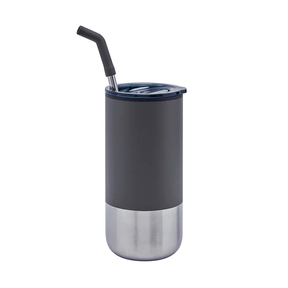 Termo doble pared. Interior de plástico y exterior de acero inoxidable. Tapa de plástico con válvula de seguridad y popote metálico con boquilla removible de rubber. Incluye caja individual.