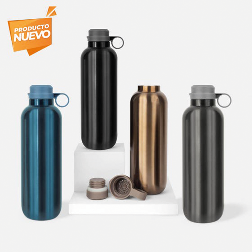 Doble pared. Cerrado al vacío. Pared interna y externa de acero inoxidable. Tapa de bambú con sistema de rosca, asa de silicón y base de bambú. Mantiene temperatura caliente 6 hrs y temperatura fría 12 hrs. Incluye caja individual.