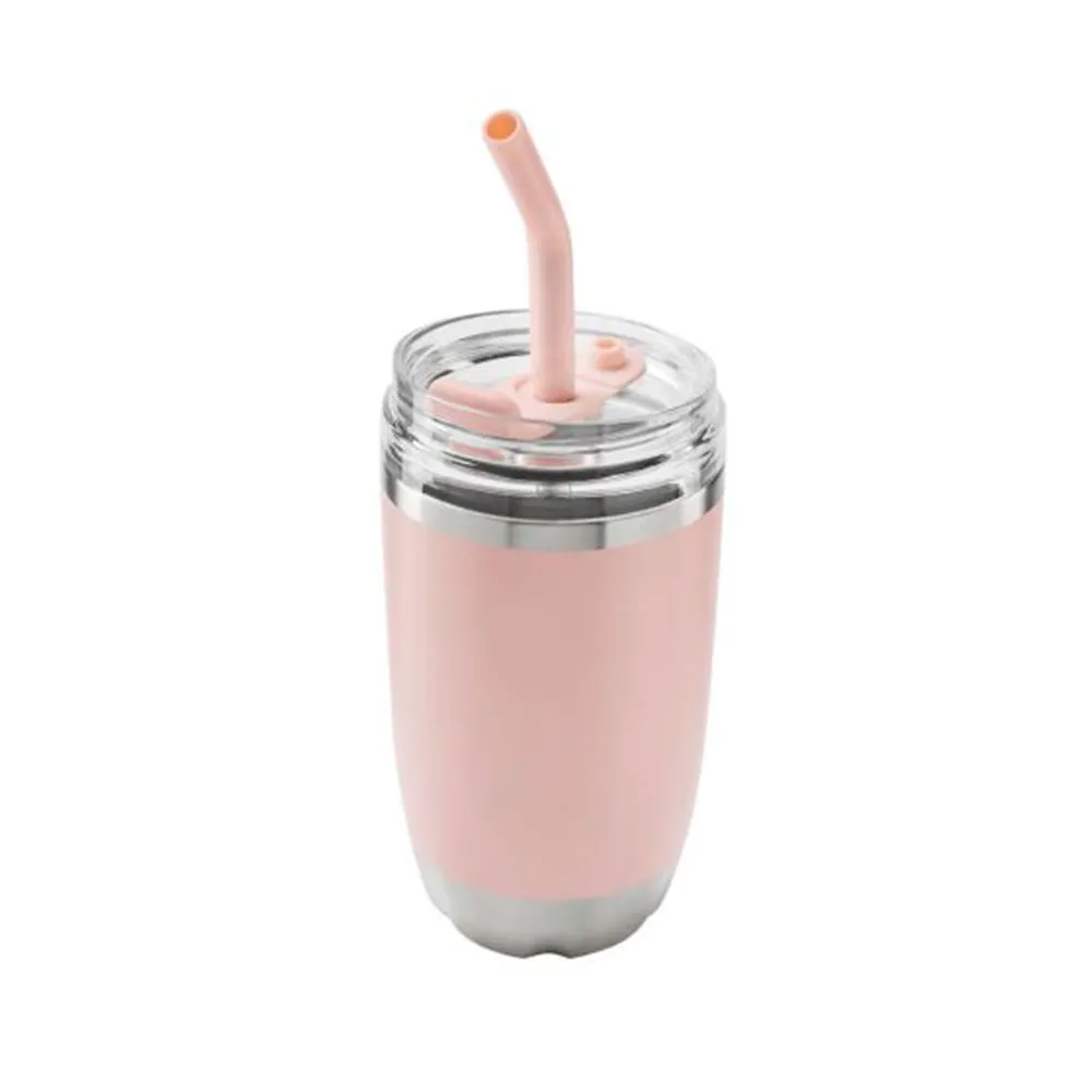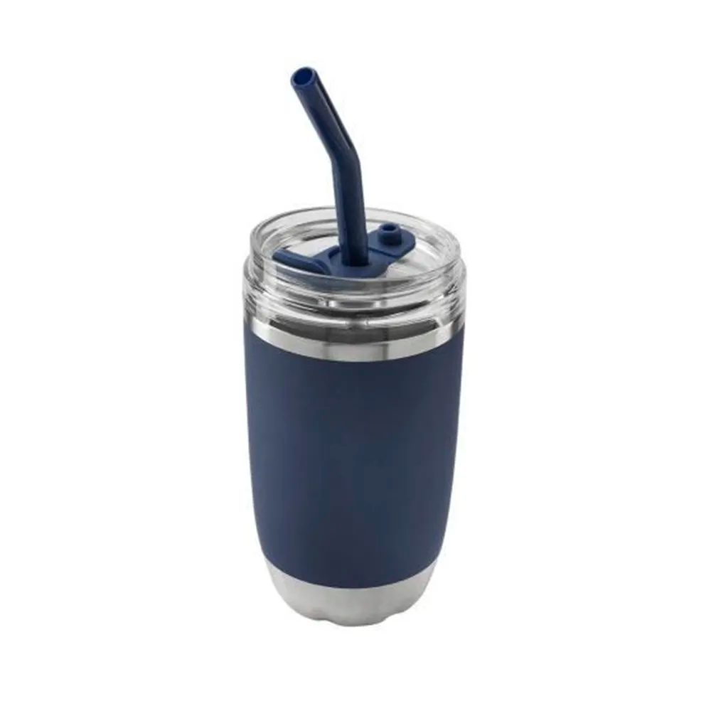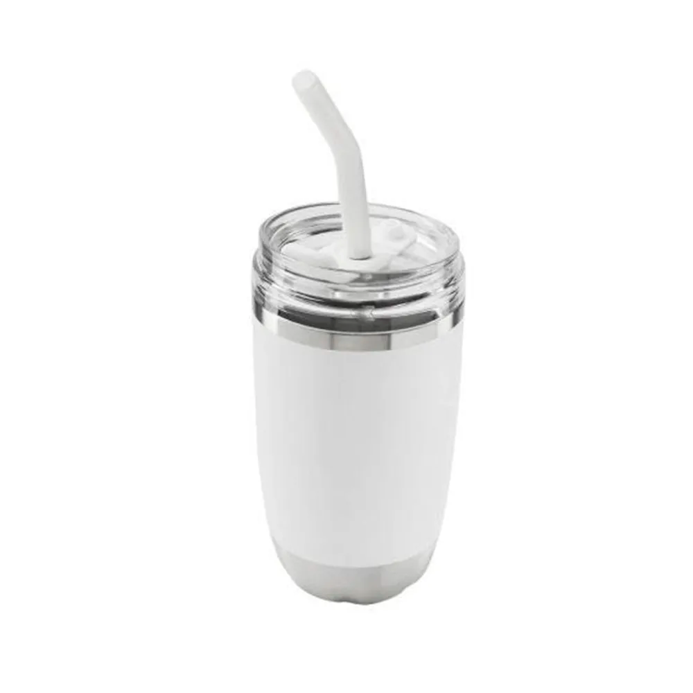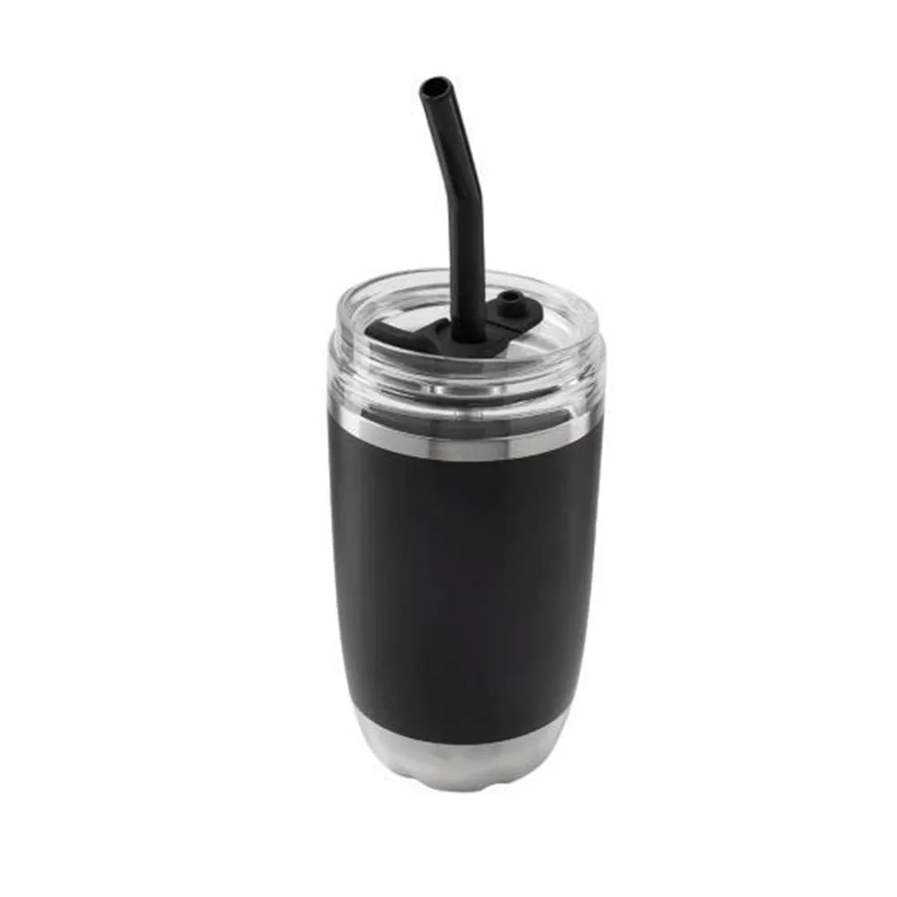 Doble pared. Cerrado al vacío. Pared interna y externa de acero inoxidable. Tapa push de plástico con sobretapa de silicón removible y ranura especial con tapón para popote. Incluye popote metálico con boquilla de silicón. Mantiene temperatura caliente 2 hrs y temperatura fría 8 hrs. Caja individual incluida.