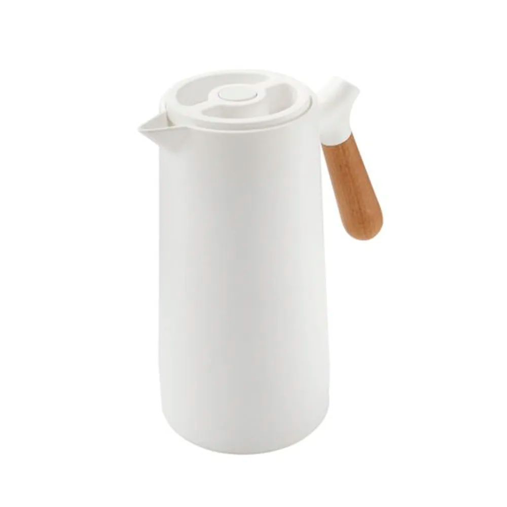 Jarra térmica doble pared. Interior de vidrio y exterior de plástico. Tapa con botón dispensador y asa de bambú. Base removible con sistema de rosca que permite retirar fácilmente el interior para una mejor limpieza. Mantiene temperatura caliente y fría 6 hrs. Incluye caja individual.