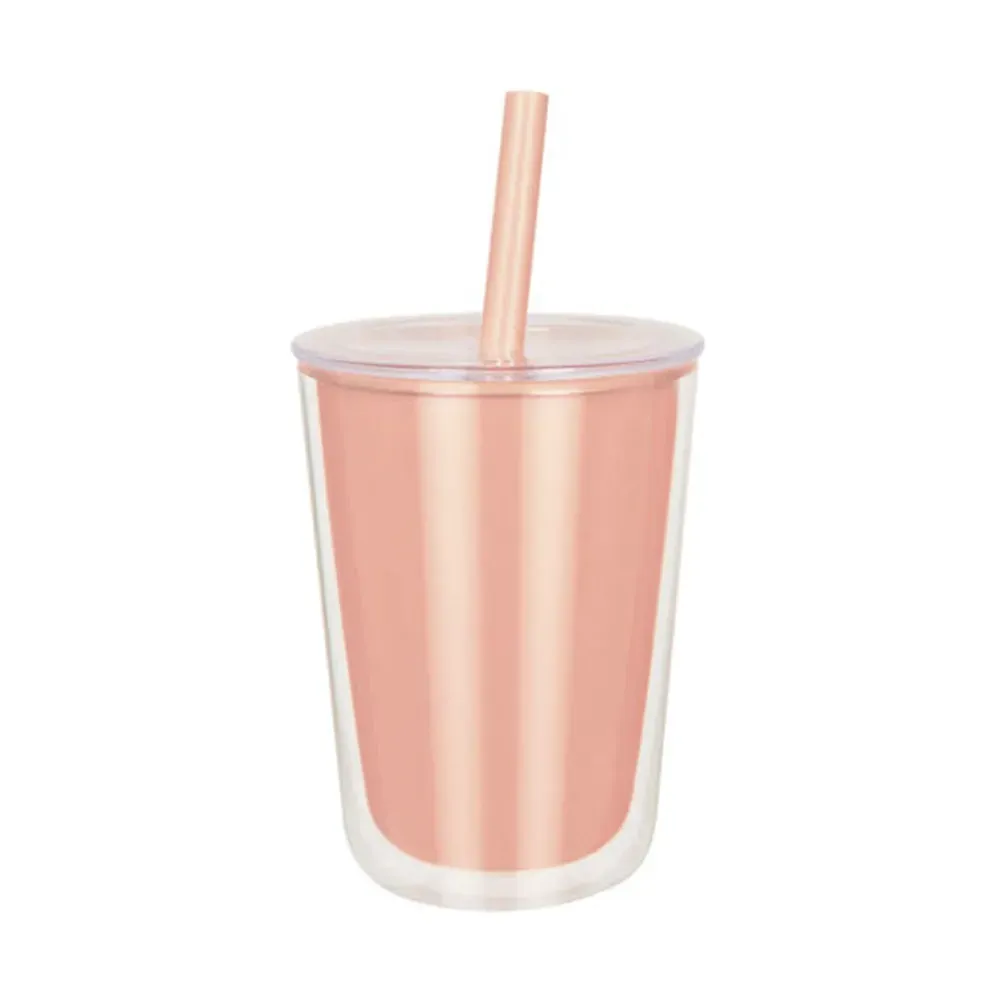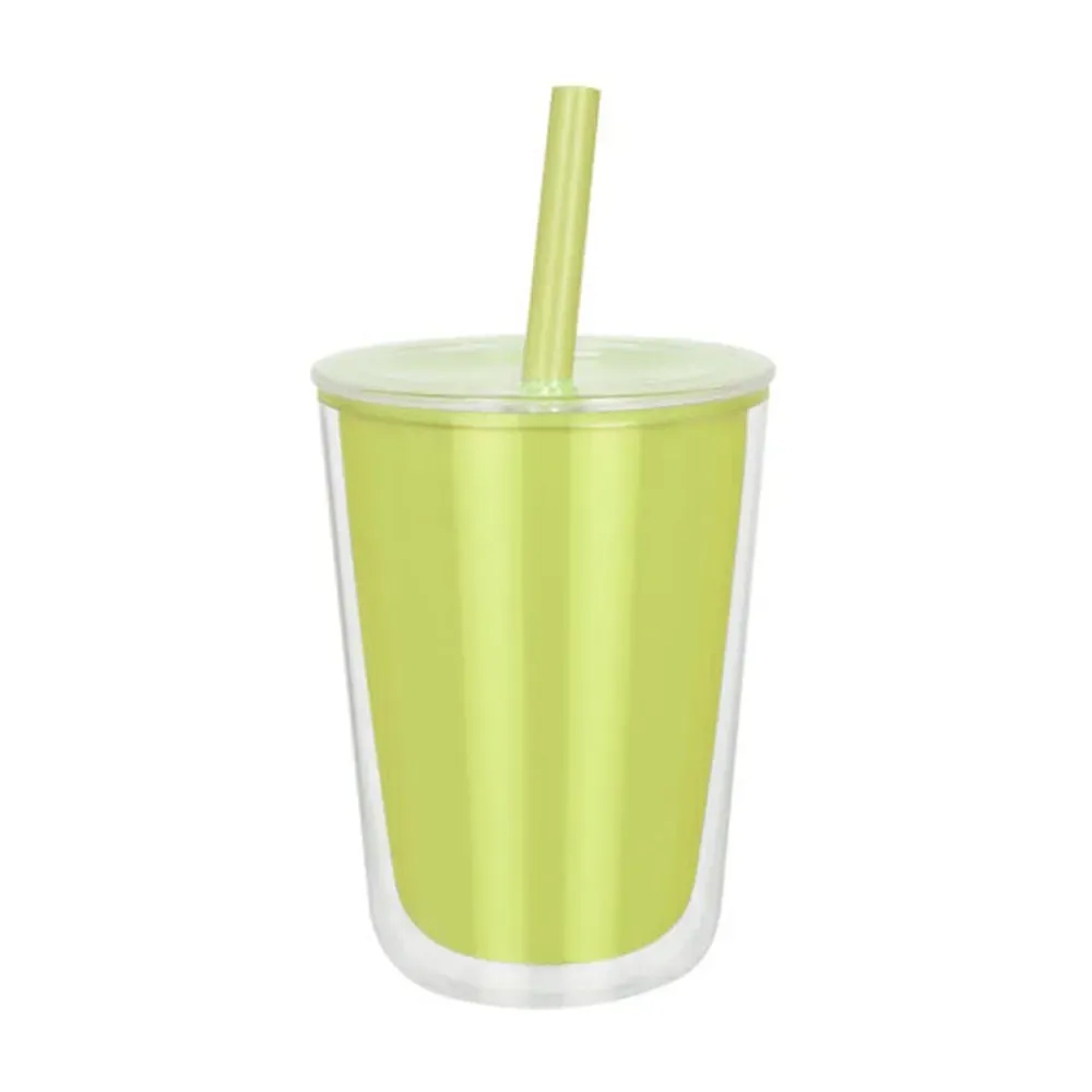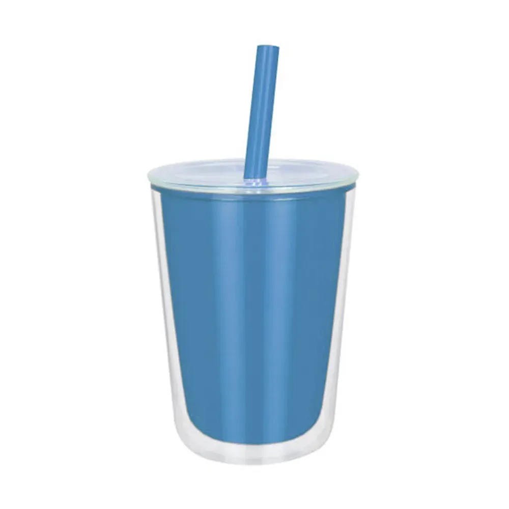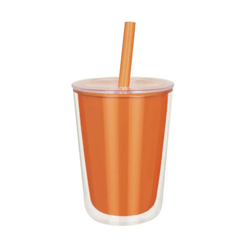 Vaso de plástico doble pared. Su peculiar diseño, cuenta con una pared interna de color y una pared externa transparente, que le da un aspecto moderno y vibrante. La tapa con cierre push y el popote a juego, añaden originalidad a este vaso. Ideal para llevar tus bebidas favoritas a donde vayas. Capacidad de 23 Oz. Base de 9 cm de diámetro. Incluye caja individual.