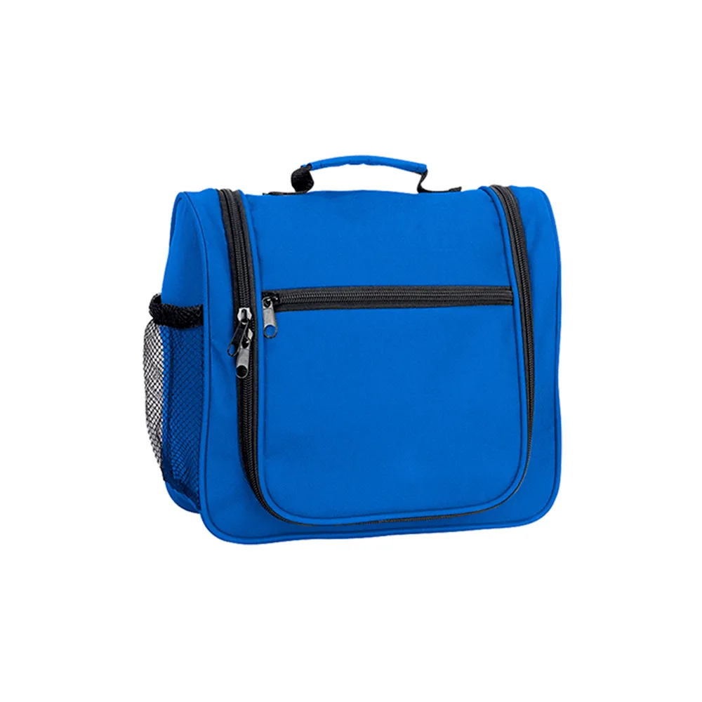Bolsa multiusos fabricada en poliéster con agarradera, compartimento al frente con cierre, bolsa lateral tipo red y apartado despegable con varios compartimentos, resortes sujetadores, bolsa tipo red, 2 bolsas transparentes y arnés de plástico para colgar.
