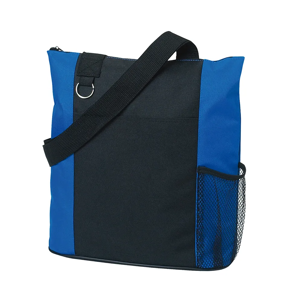Bolsa con cierre fabricada en poliéster 600D (Tiene alta resistencia y capacidad de recuperación elástica, por lo que es resistente al desgaste, duradero, resistente a las arrugas y no se plancha), con bolsa lateral tipo red, correa para colgar en hombro y argolla metálica.