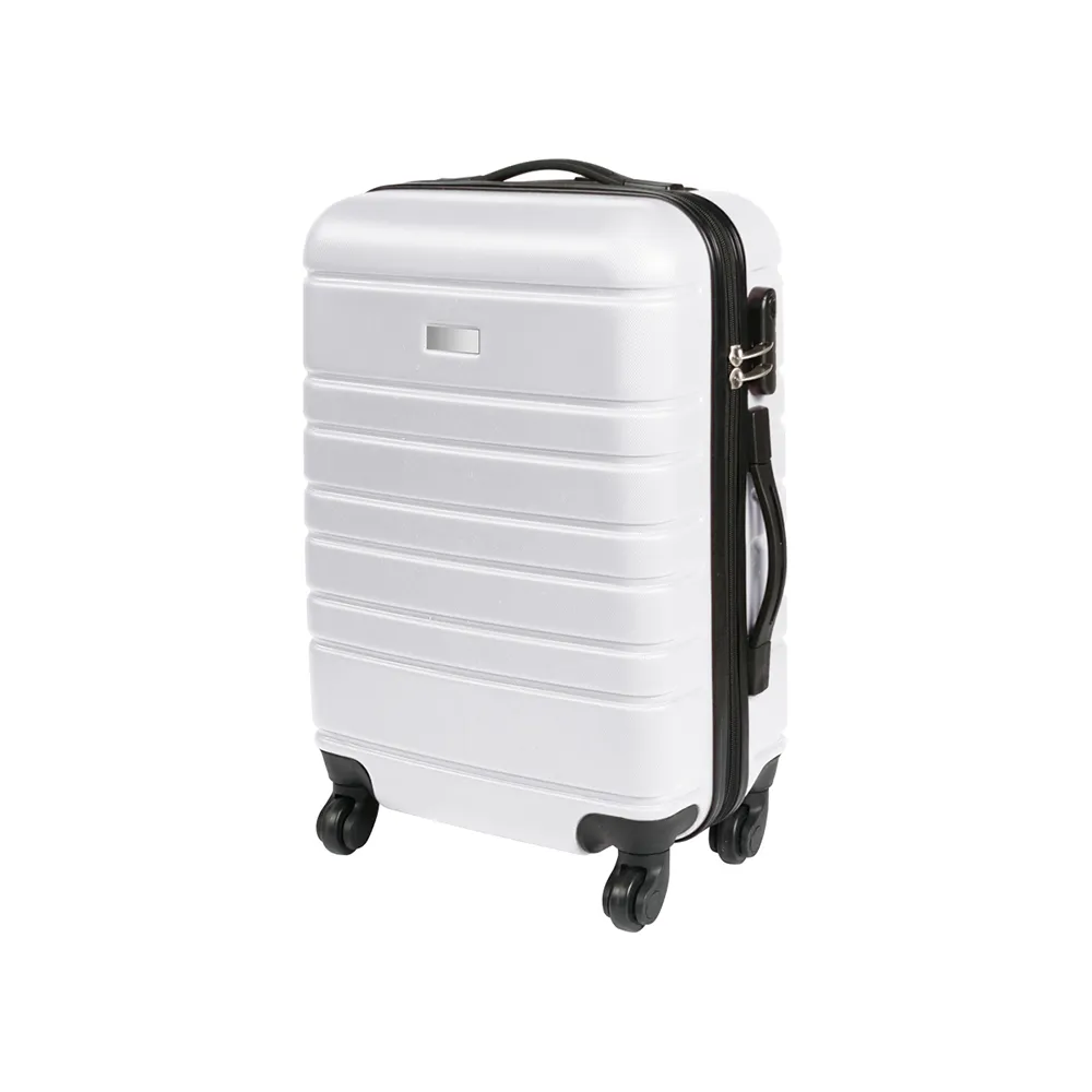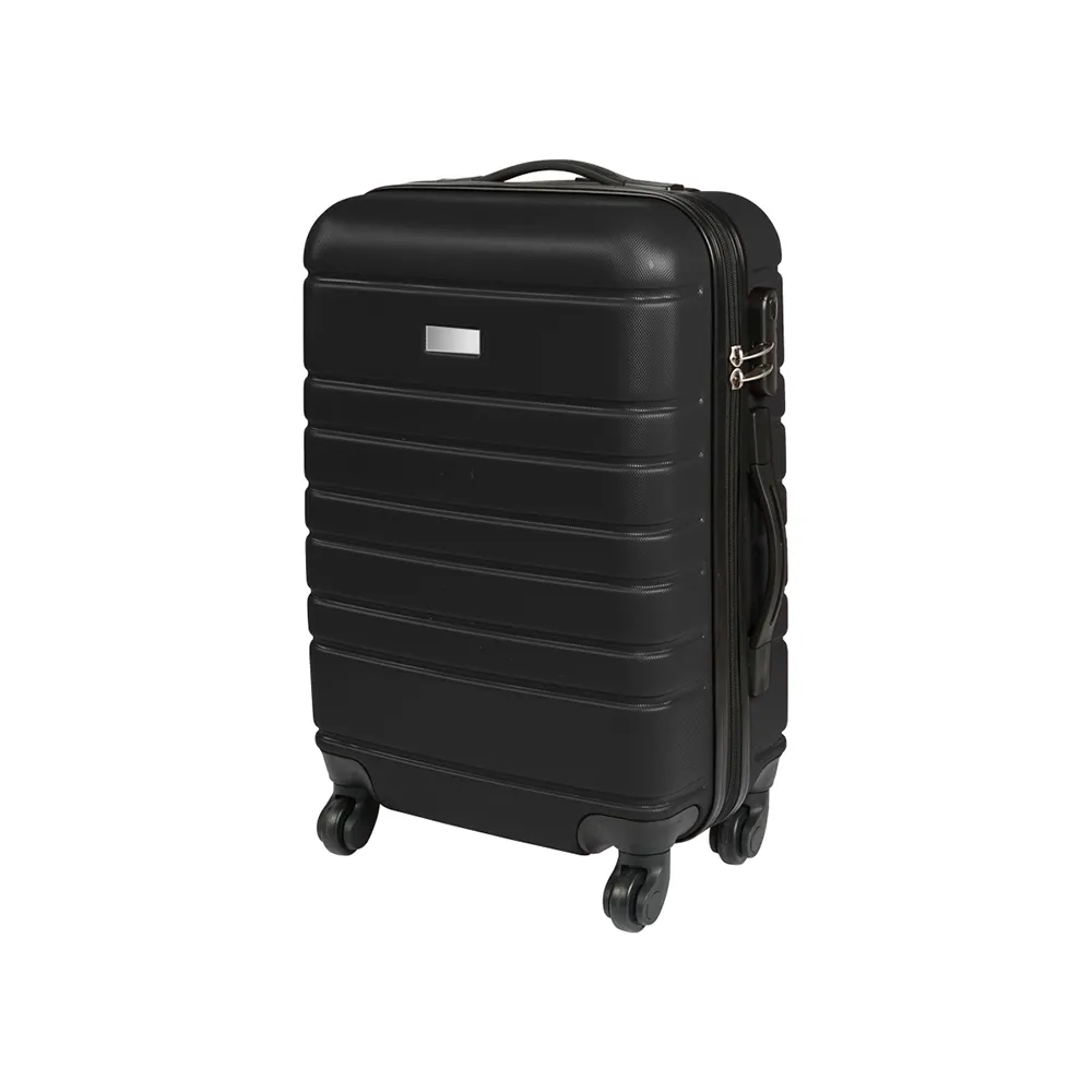Maleta rígida de viaje con exterior fabricado en plástico ABS e interiores en poliéster, con mango retráctil de aluminio, 4 ruedas resistentes, 2 agarraderas para poder cargarla horizontal o verticalmente, chapa de seguridad con 3 dígitos de combinación y placa metálica para grabado.