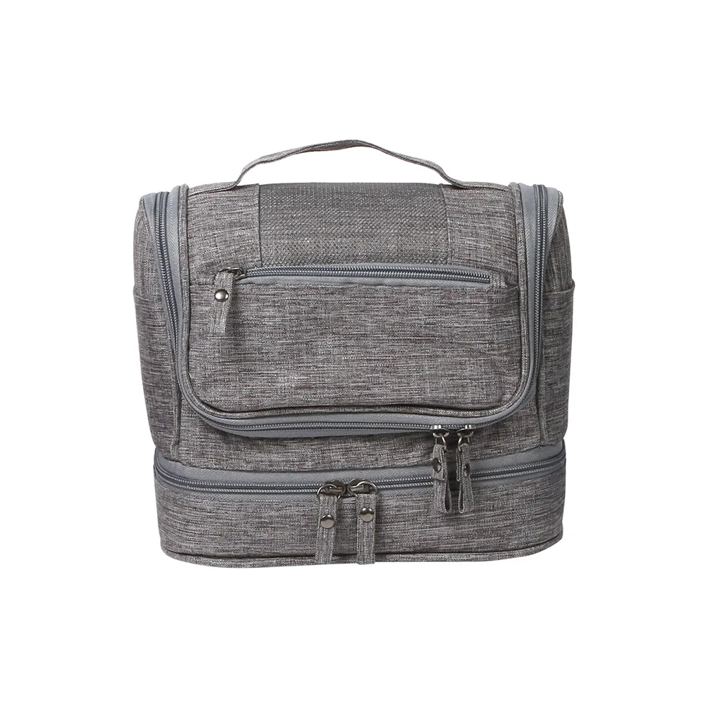Bolsa multiusos doble fabricada en poliéster, con compartimiento en la parte frontal, bolsillo en la parte inferior, asa en la parte superior de la bolsa, 2 compartimientos en los laterales, múltiples compartimientos en la parte interior. Incluye un gancho en el interior de la bolsa para colgarla.