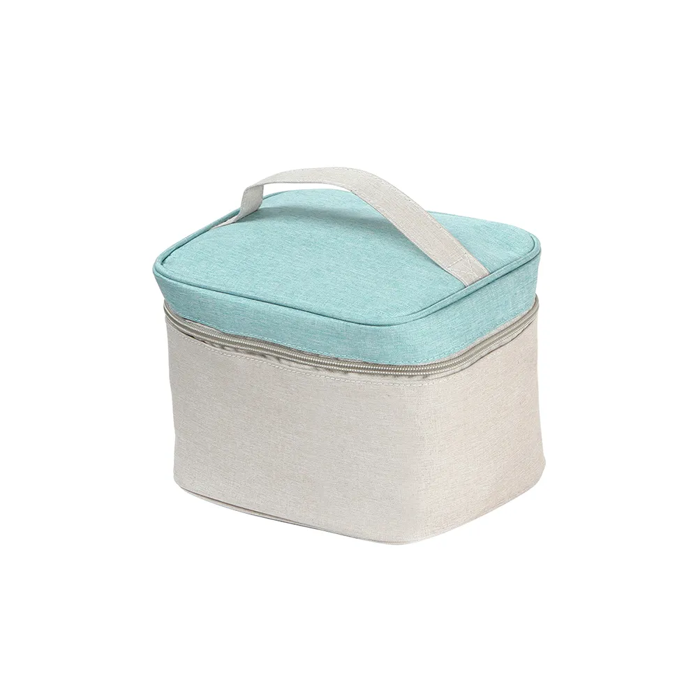 Cosmetiquera bi-tono fabricada en poliéster, bolsa de maquillaje portátil, con detalle de color en la parte superior, cuenta con una asa en la parte superior.