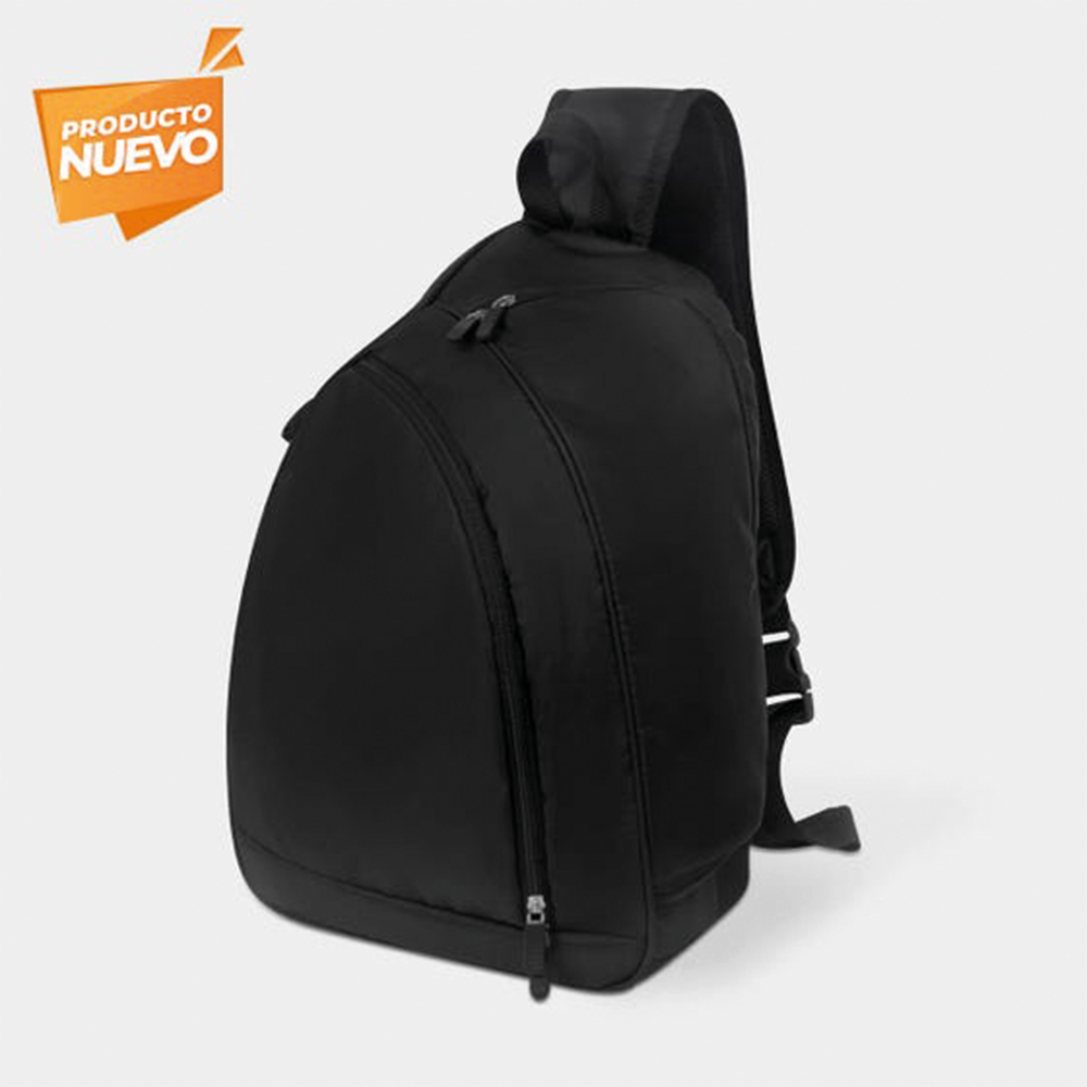 Mochila tipo backpack fabricada en poliéster con 2 bolsillos frontales, salida para puerto USB, asa superior y correas acolchadas ajustables, con tira en la parte trasera para facilitar su transporte para viajes.