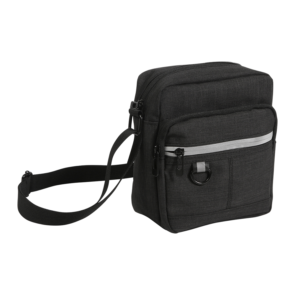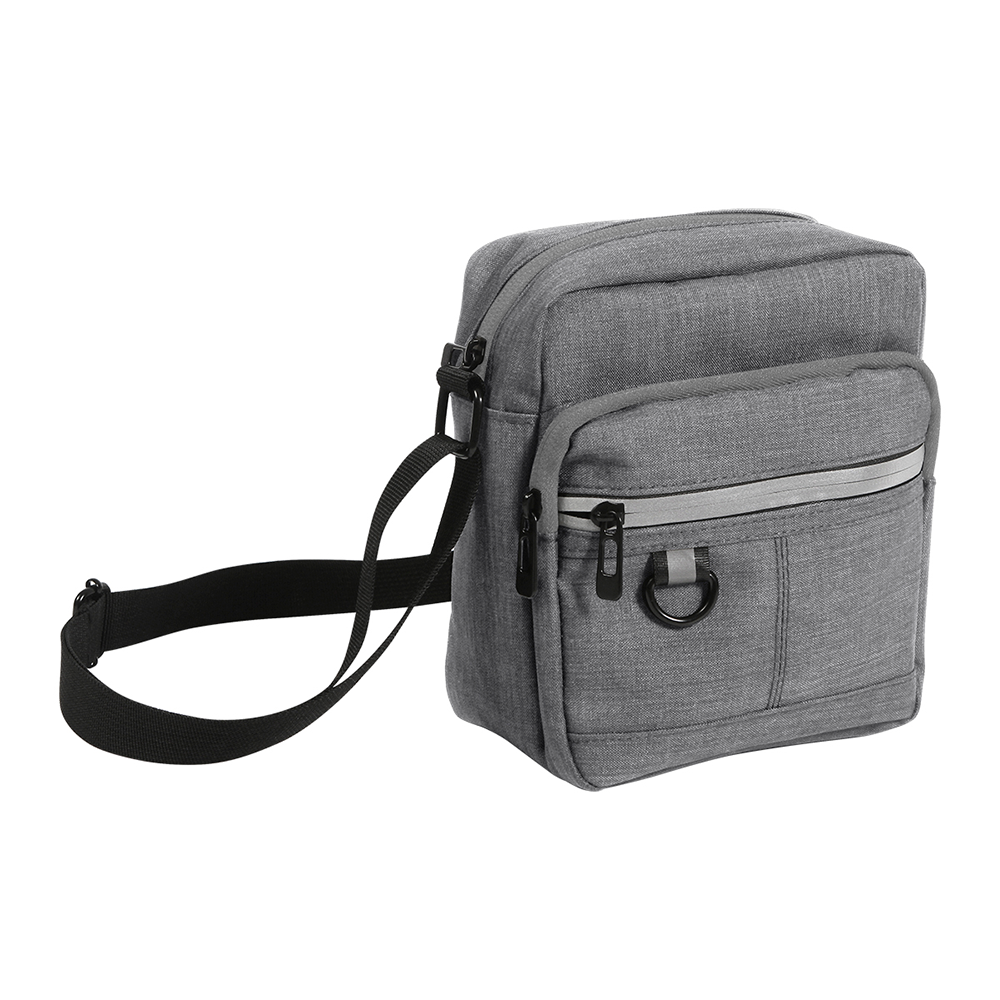 Bolsa multiusos fabricada en poliéster, cuenta con 3 con compartimientos con cierre, uno en la parte frontal, otro en la parte trasera y el bolsillo principal, el cual es el más espacioso, con correa ajustable para el hombro y una argolla en la parte frontal.